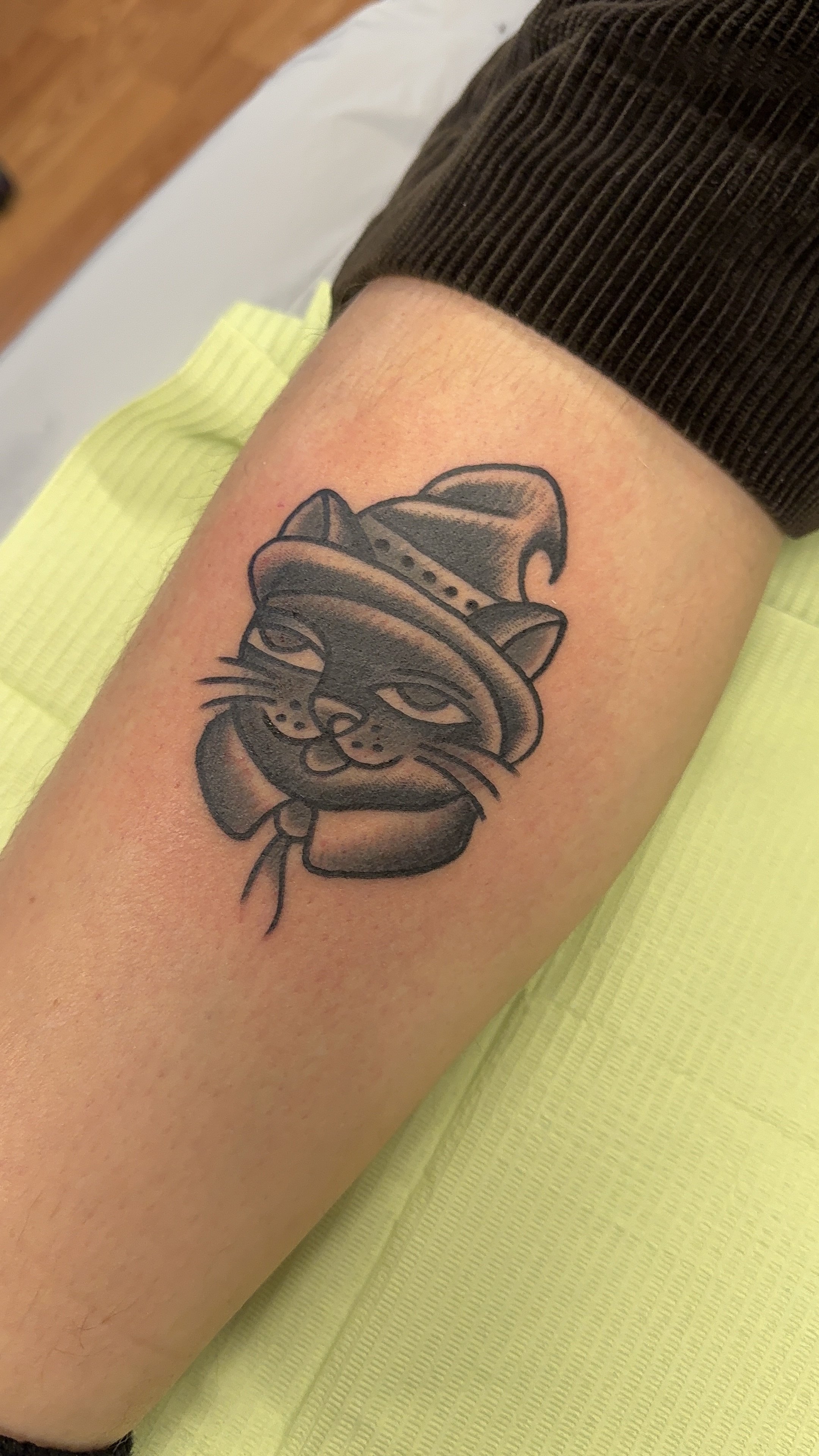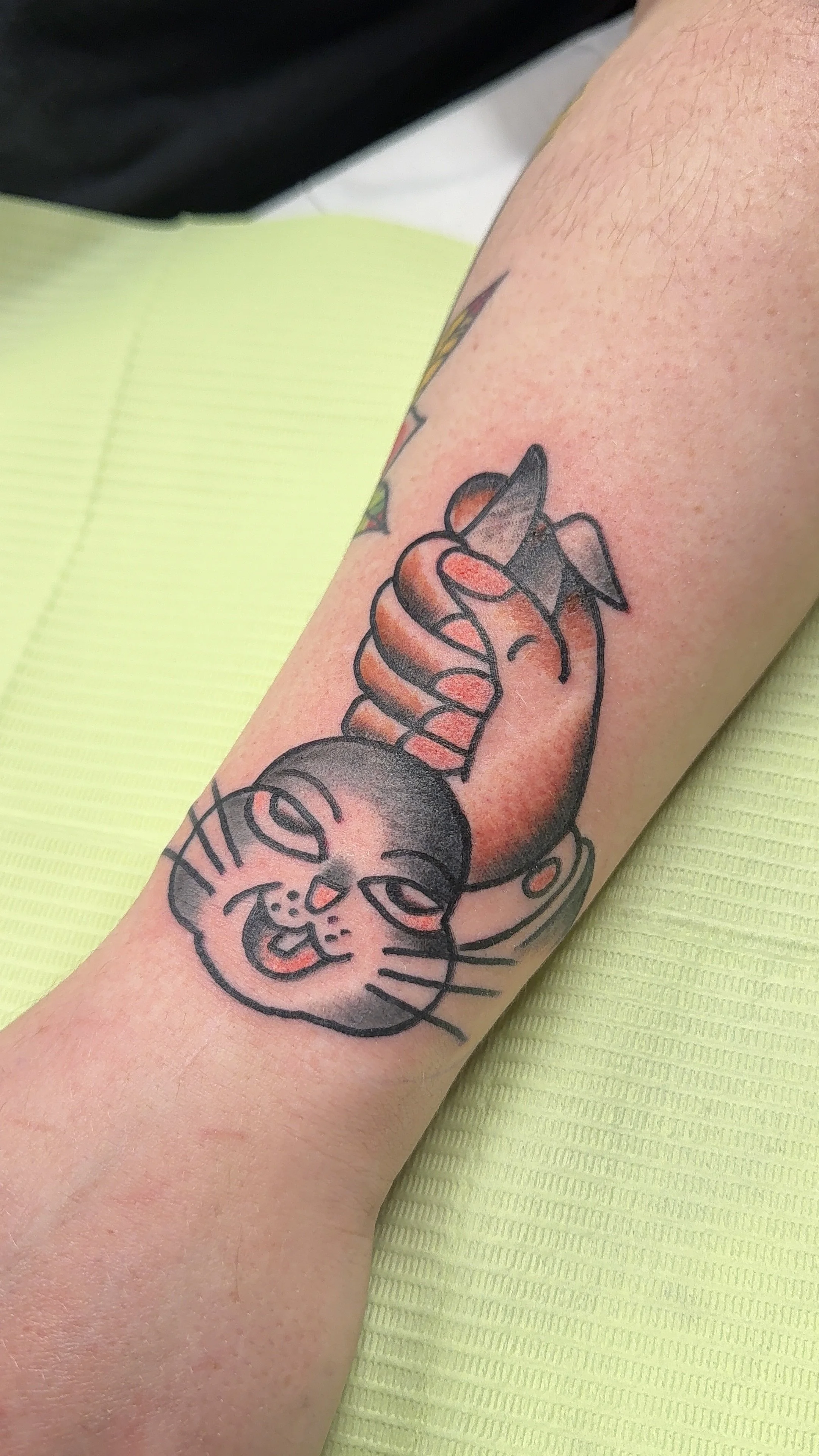 Tattoo of a cartoon cat wearing overalls and a hat, holding a basket with wheat, on a person's arm.