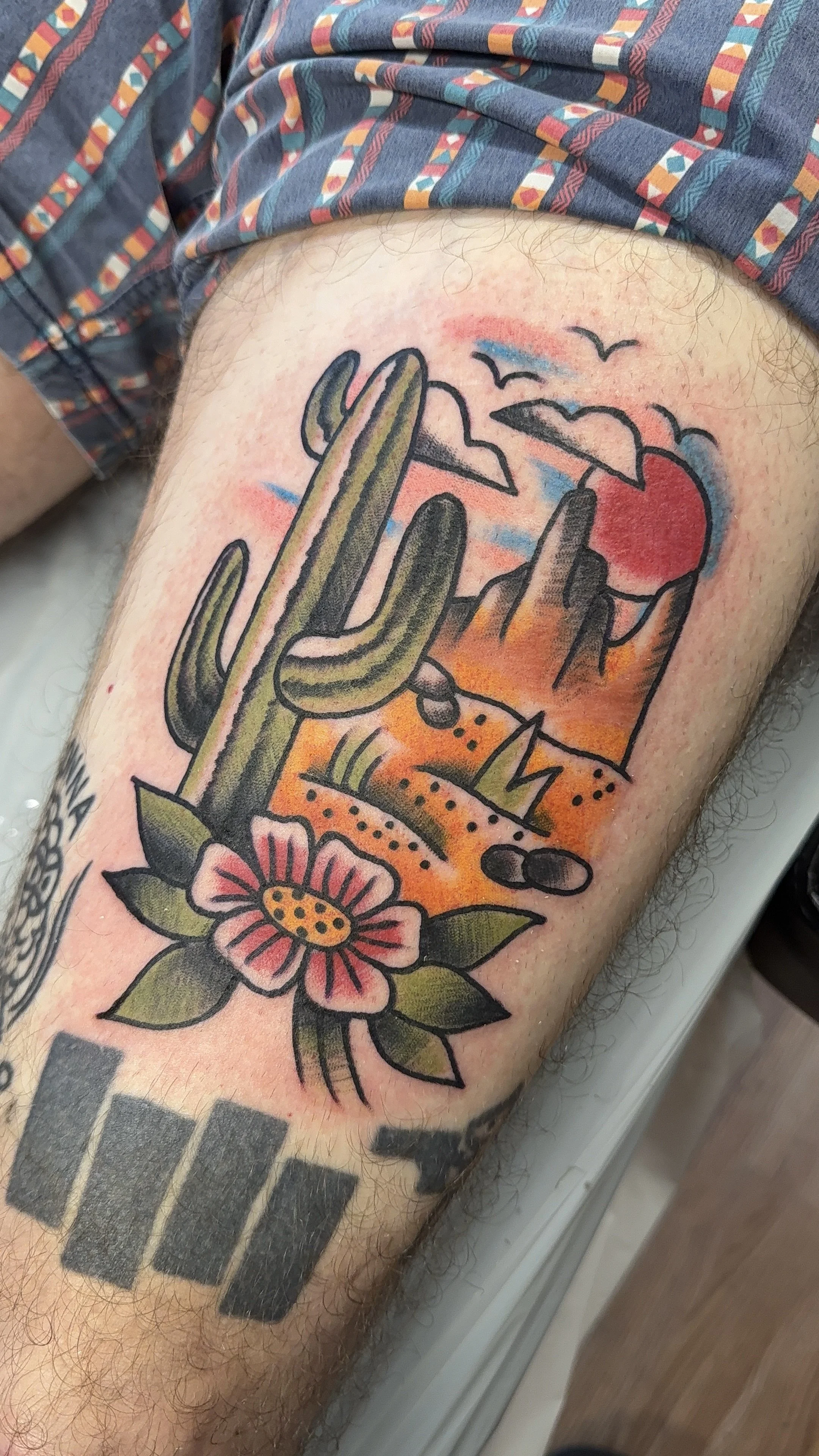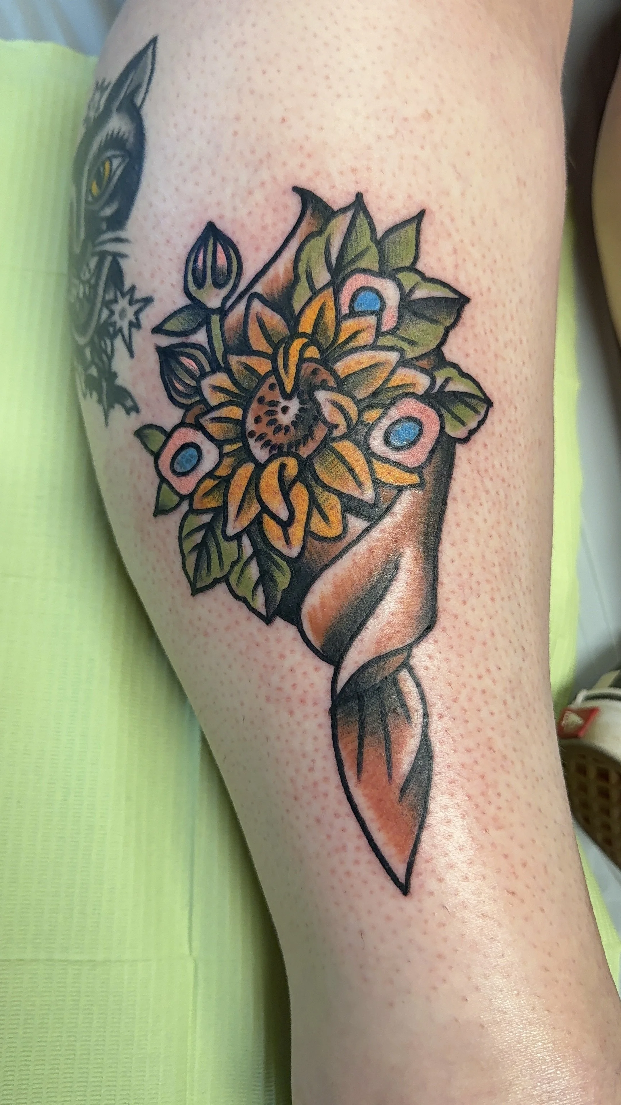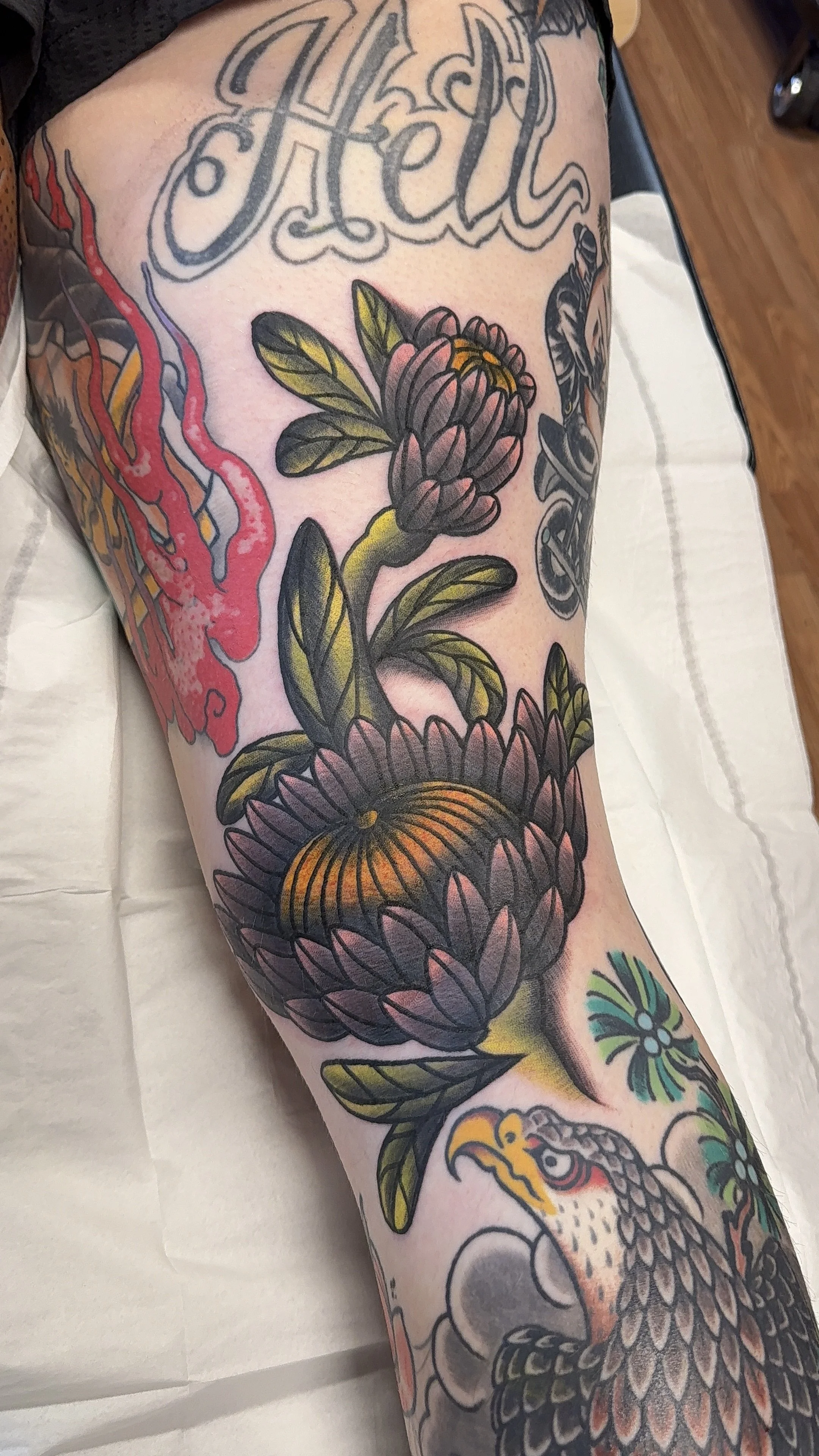 American Traditional color floral gap filler tattoo black of knee tattoo