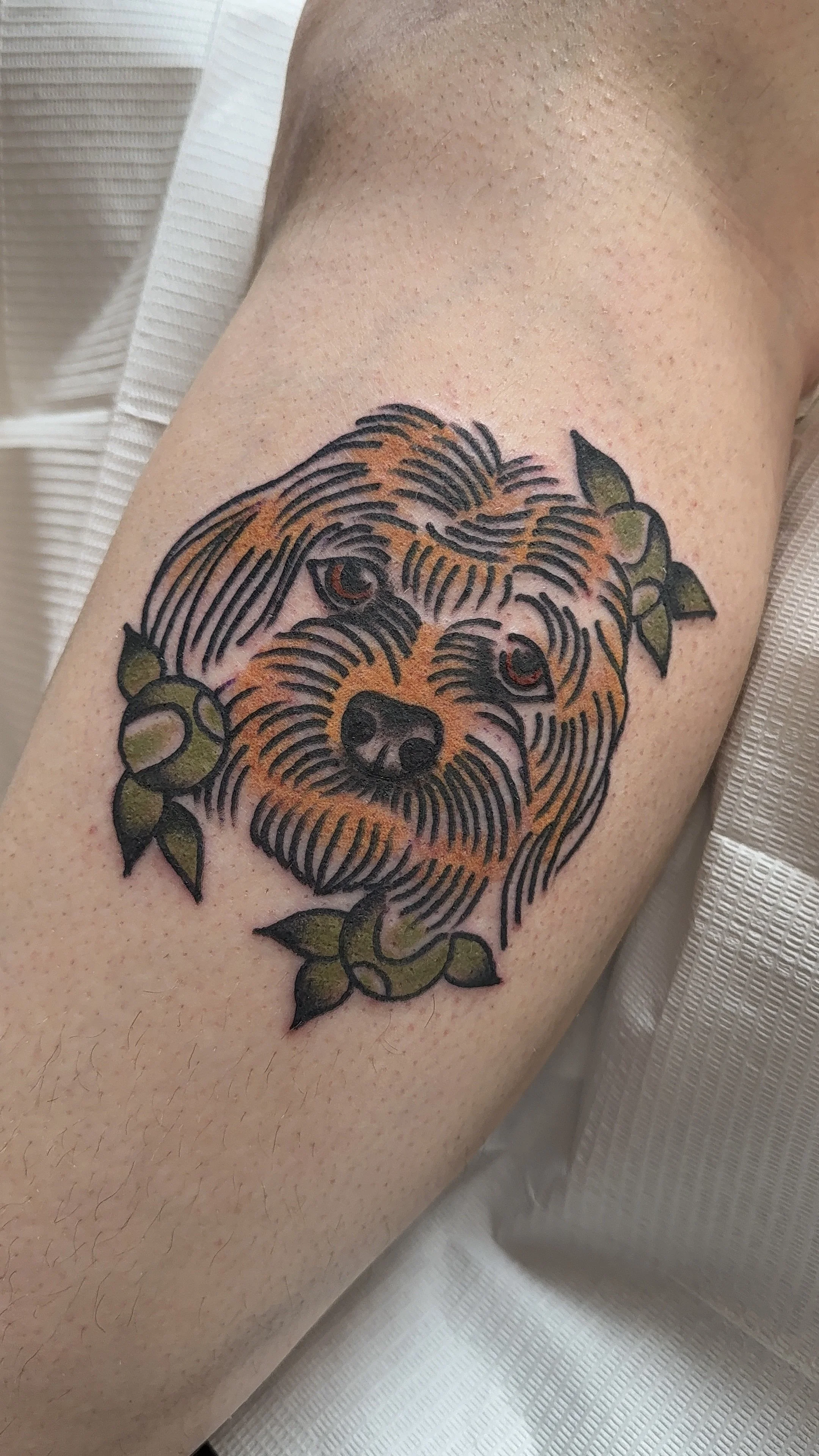 Tattoo of a dog's face surrounded by leaves and a flower on a person's skin, memorial design based ion their own dog.