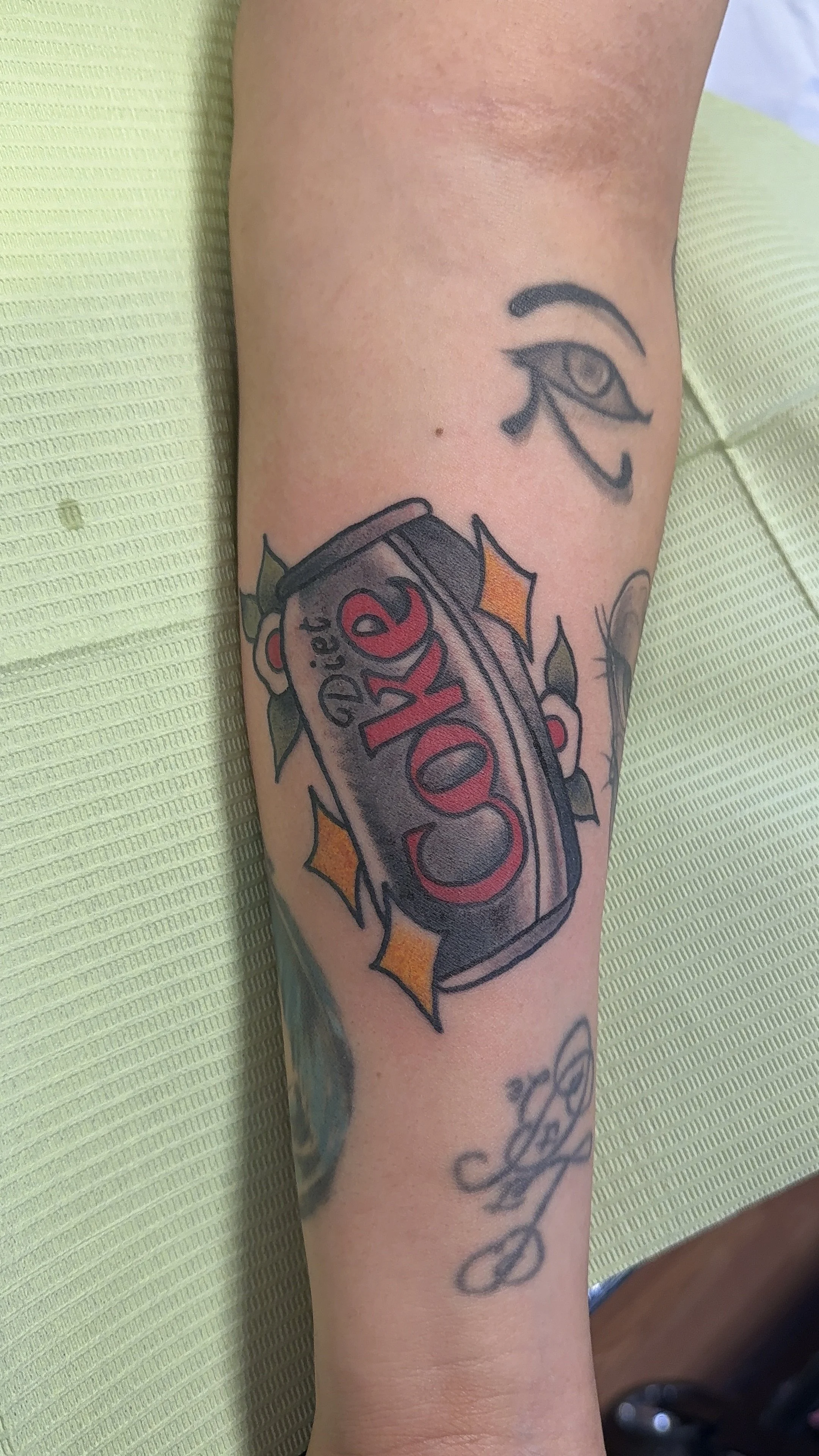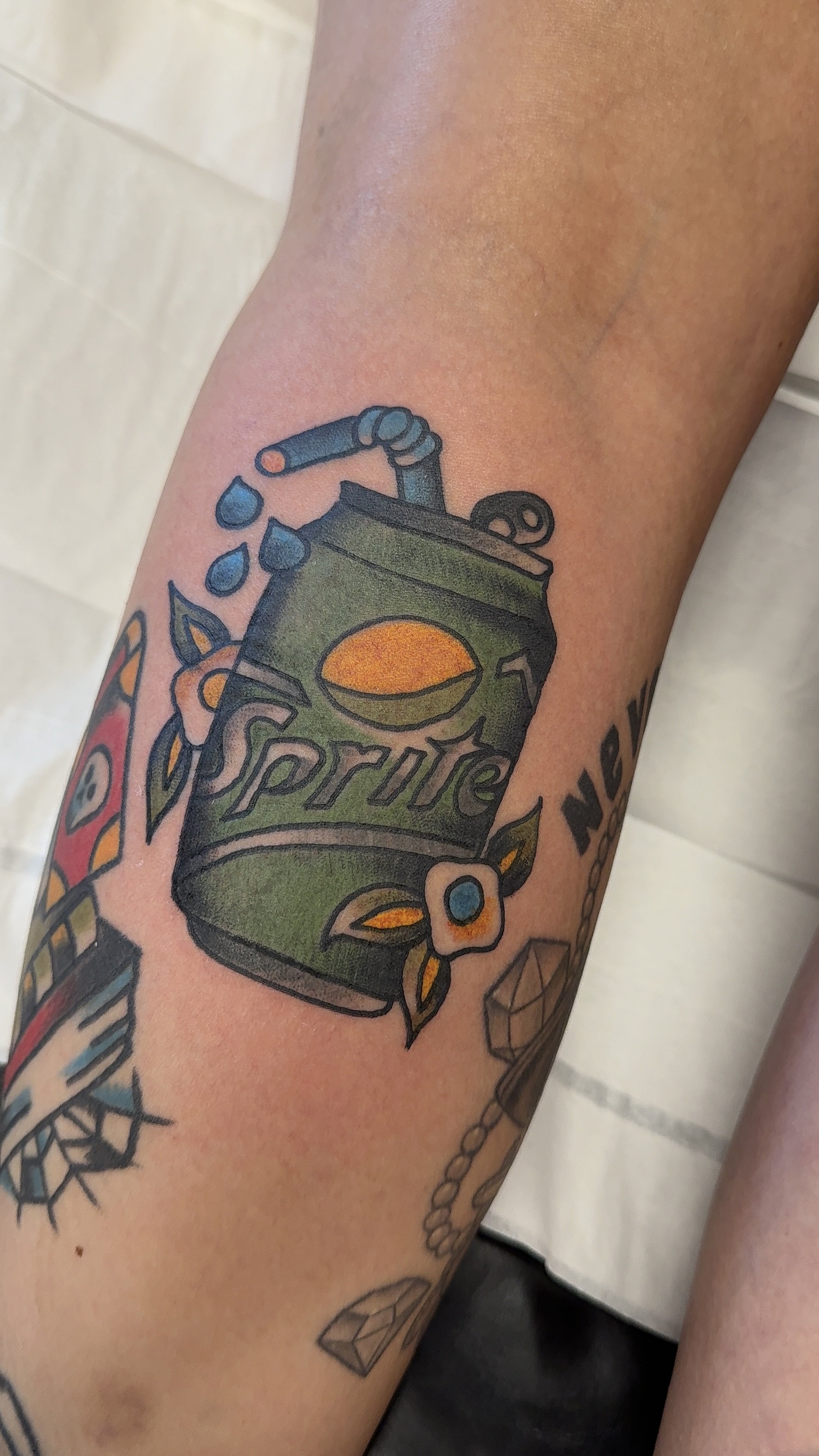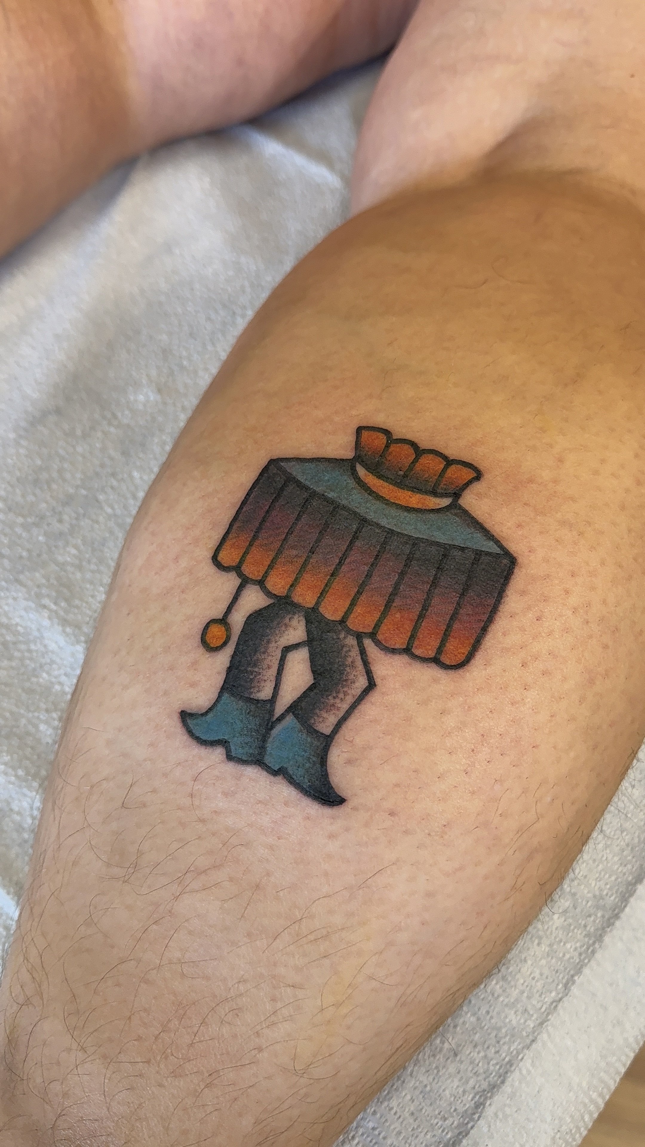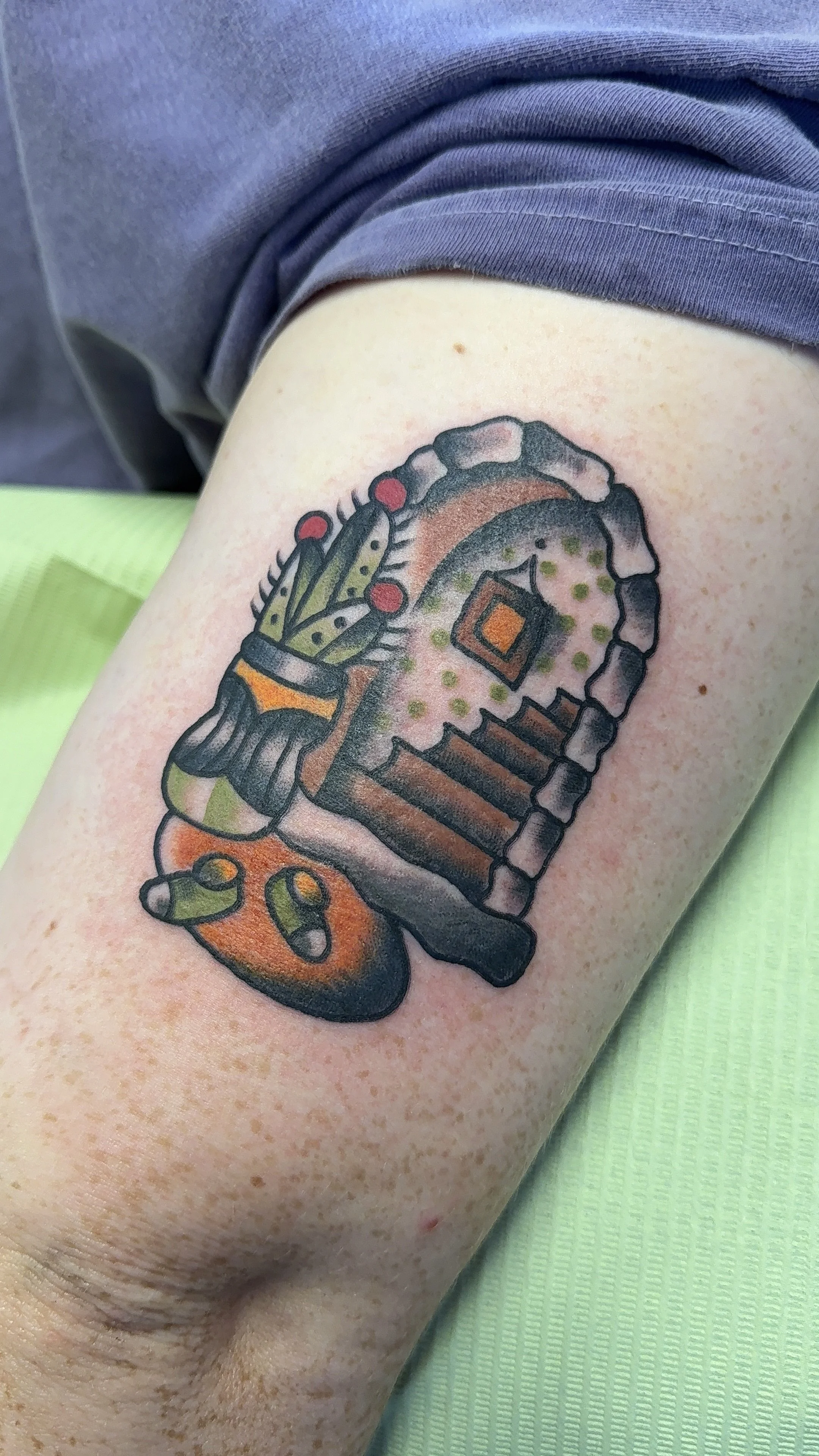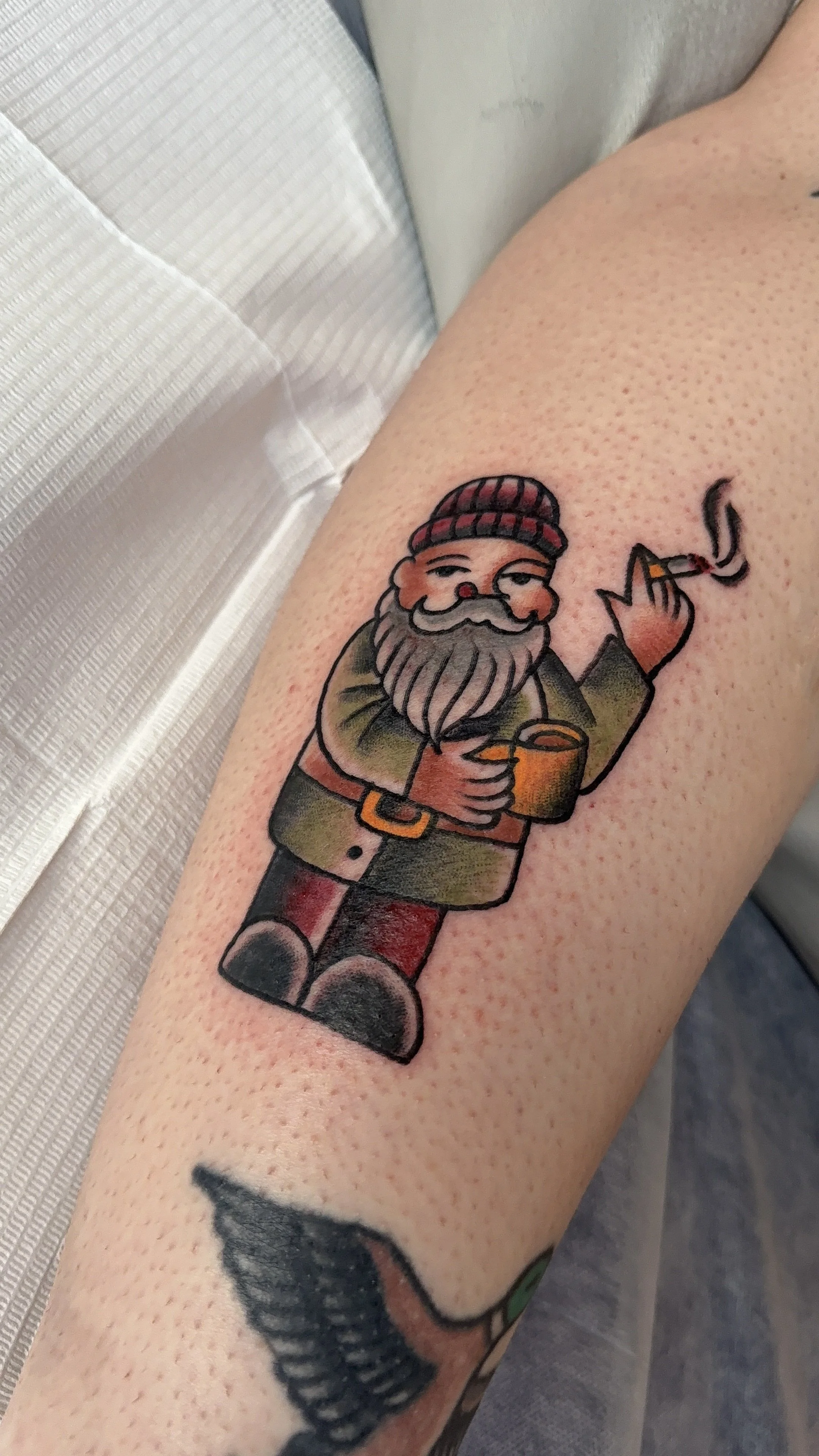 American Traditional color gnome tattoo with coffee cup and cigarette