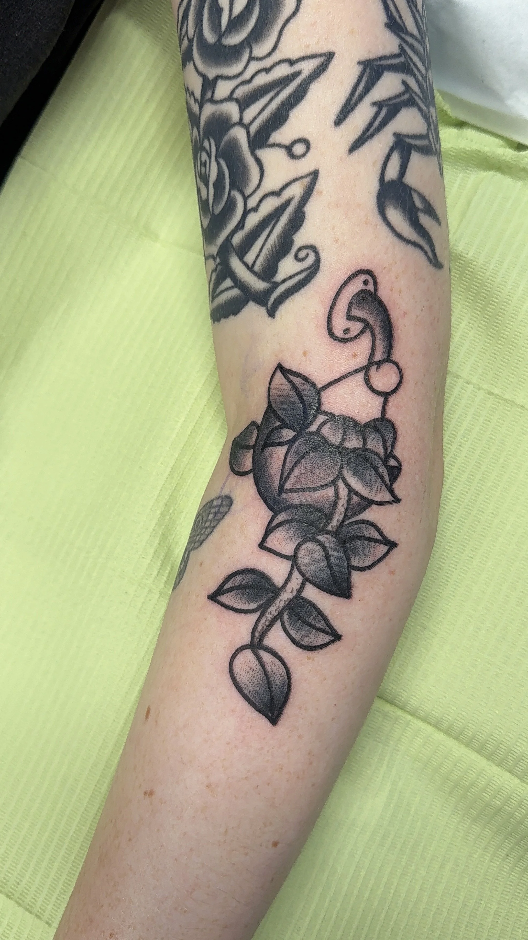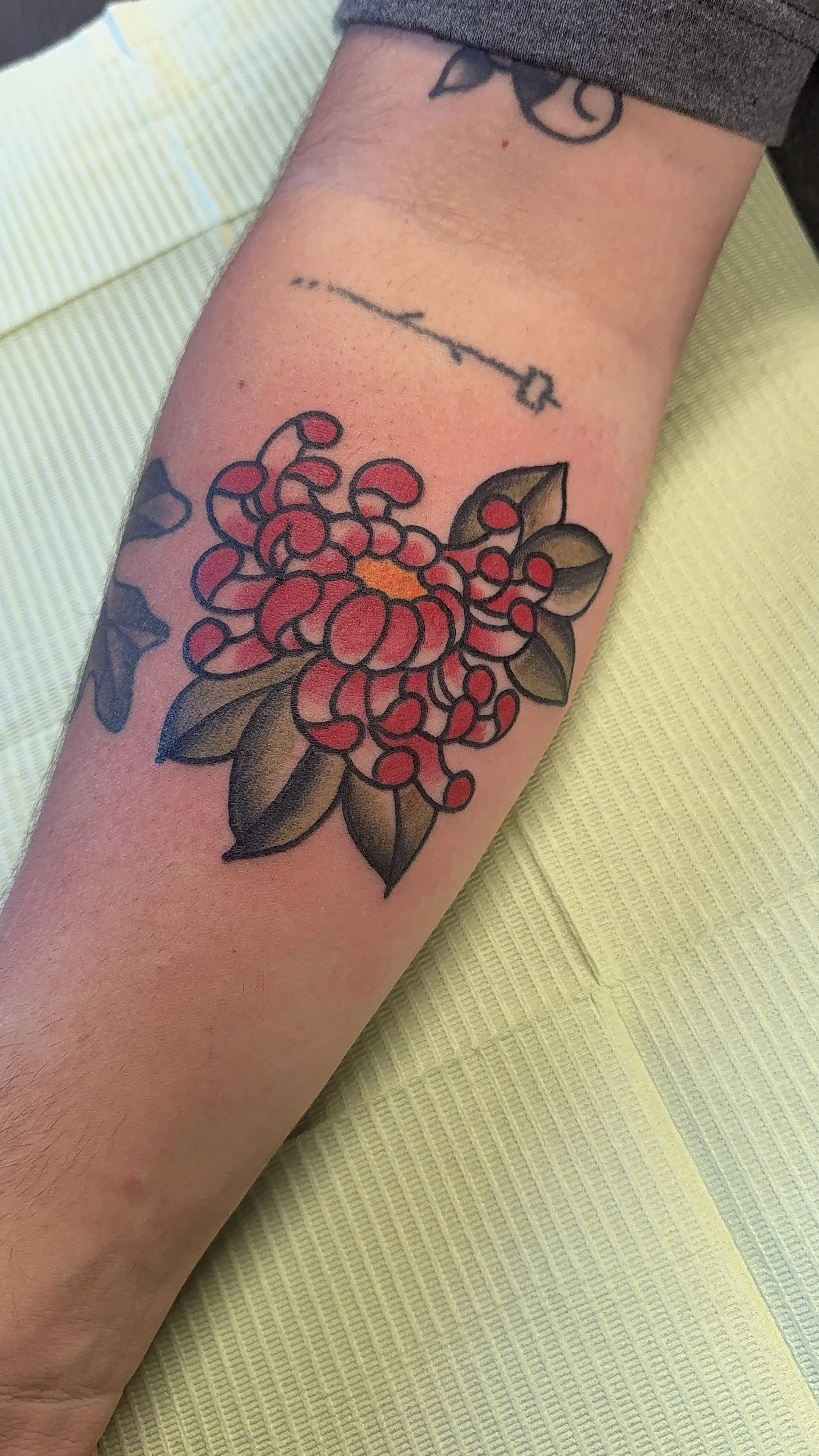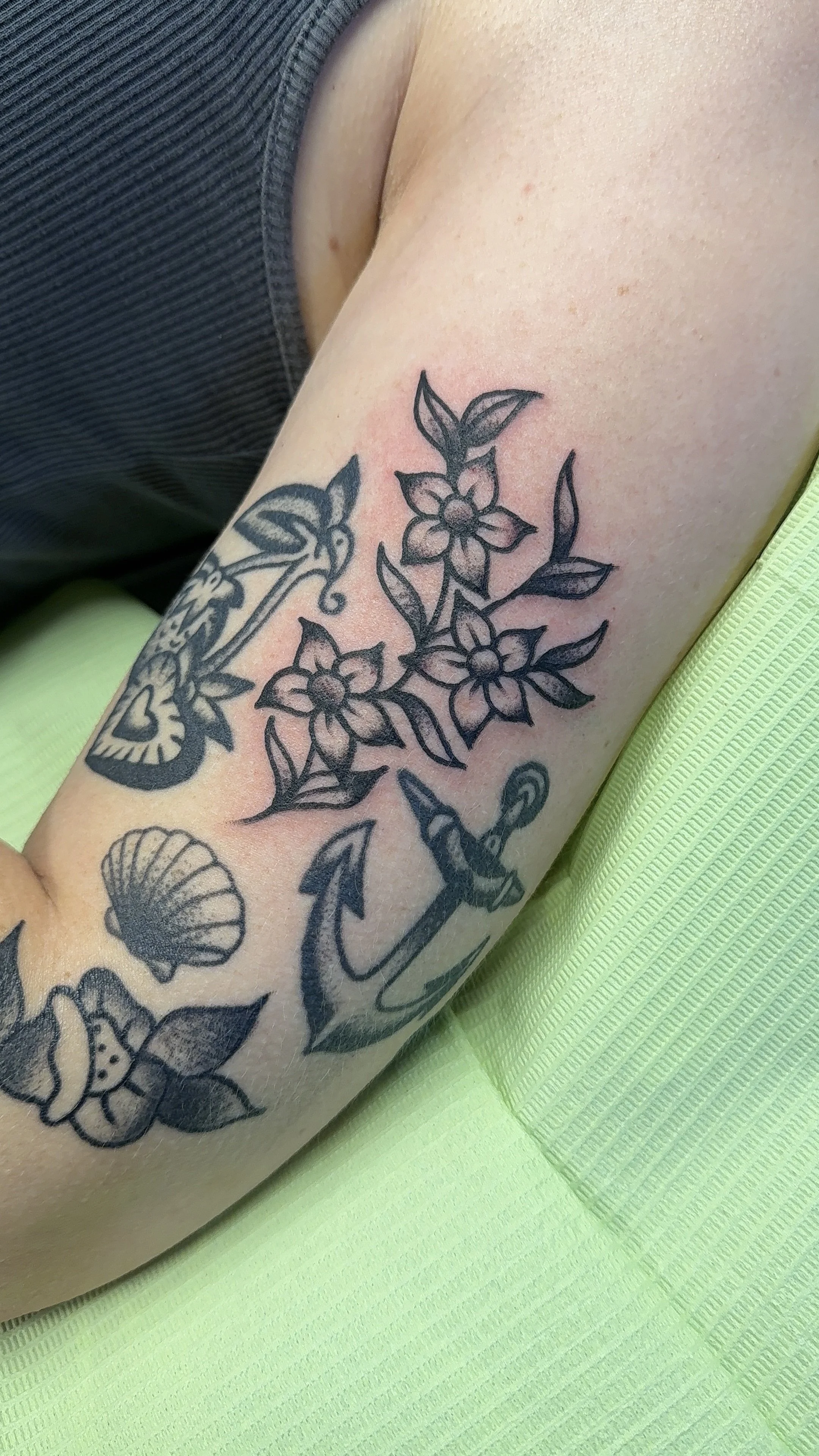 Arm with traditional-style tattoos of flowers, leaves, and decorative elements.