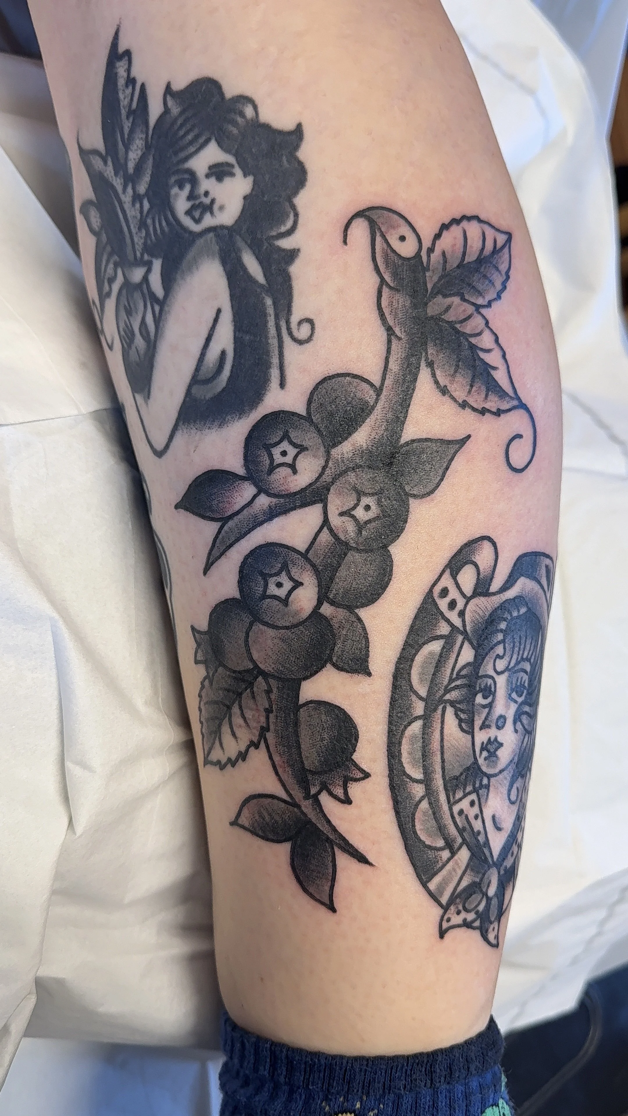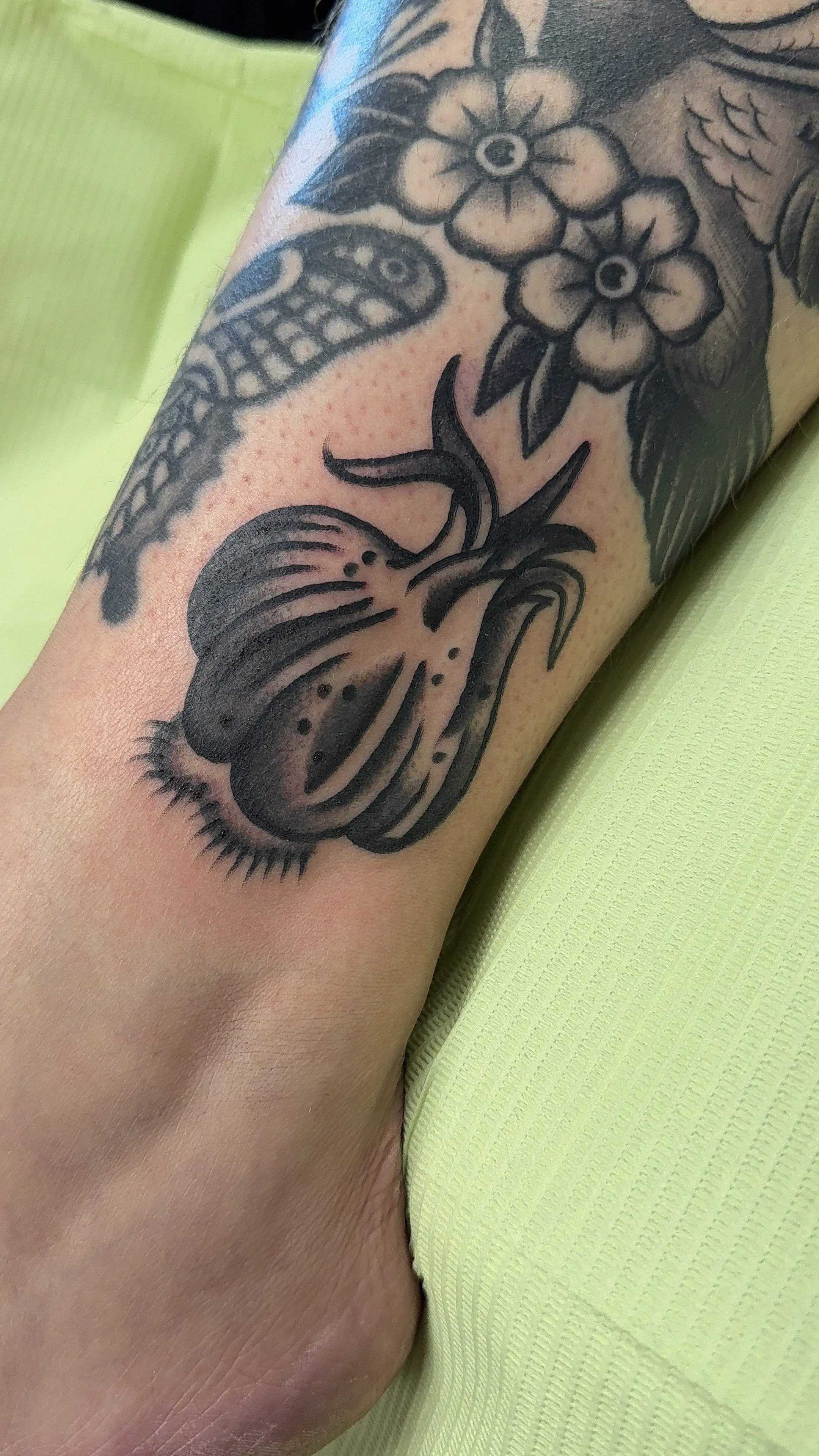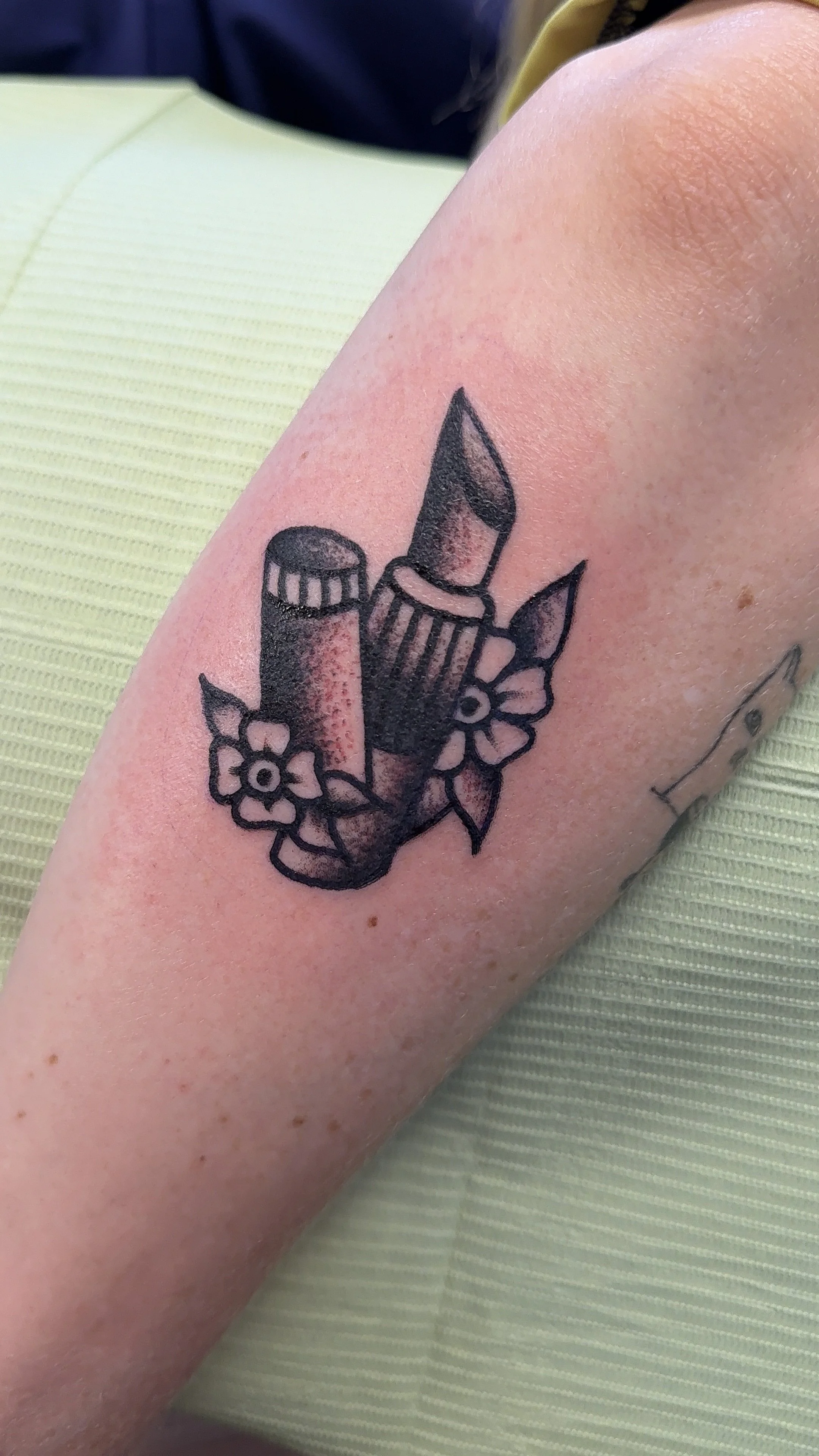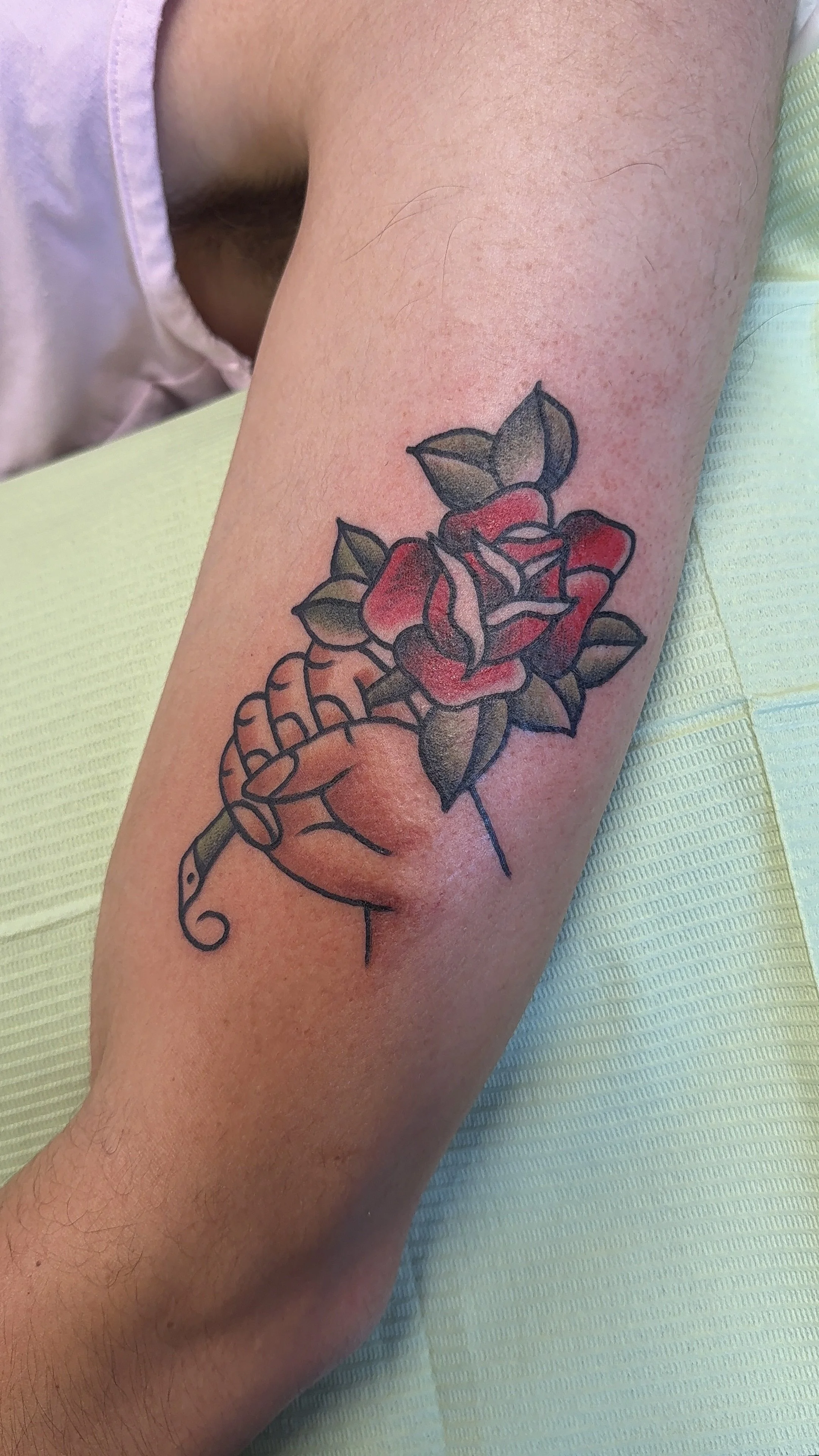 Arm with traditional-style tattoos of flowers, leaves, and decorative elements.
