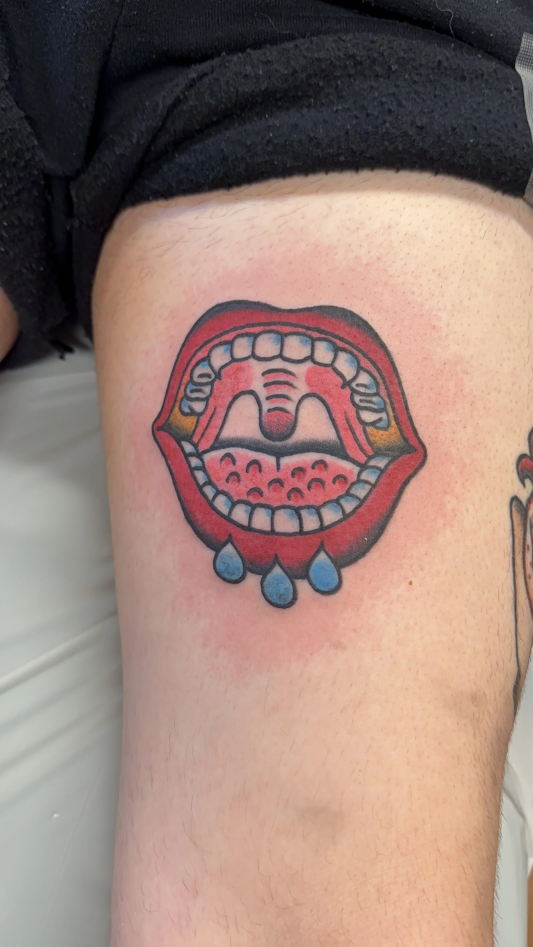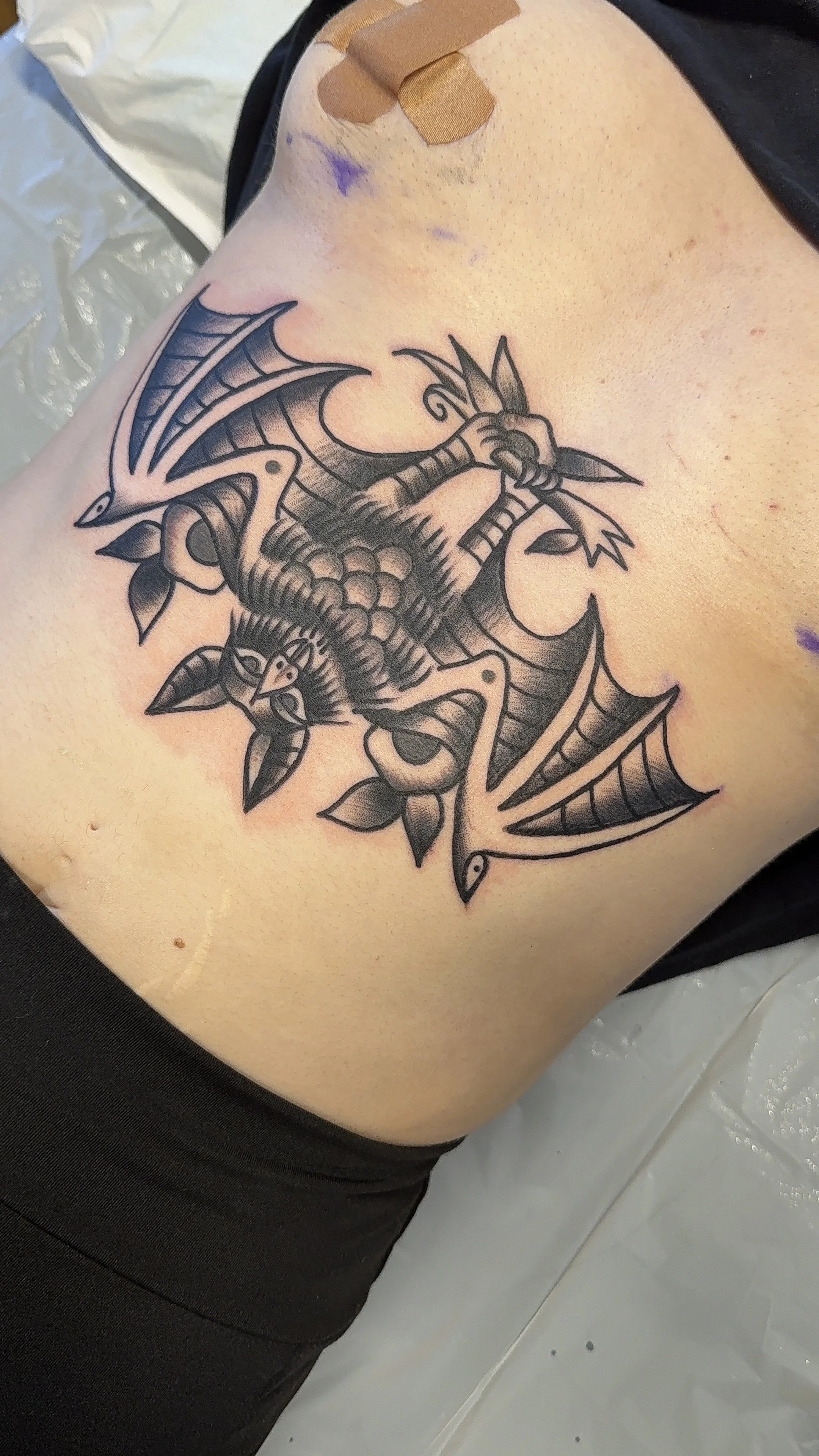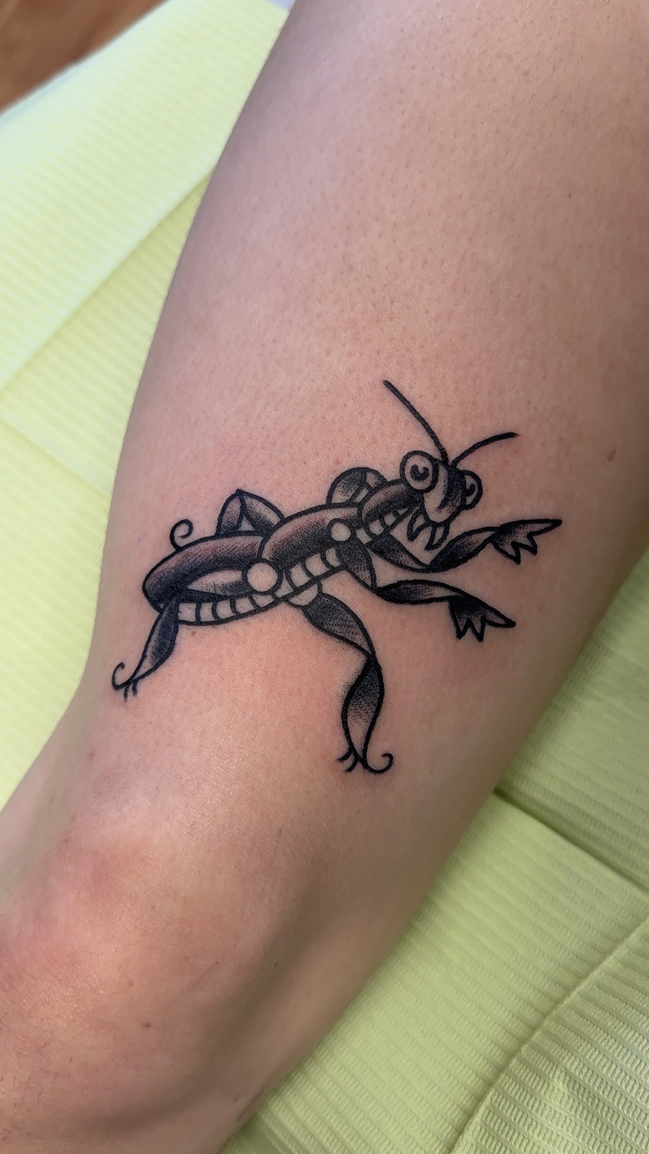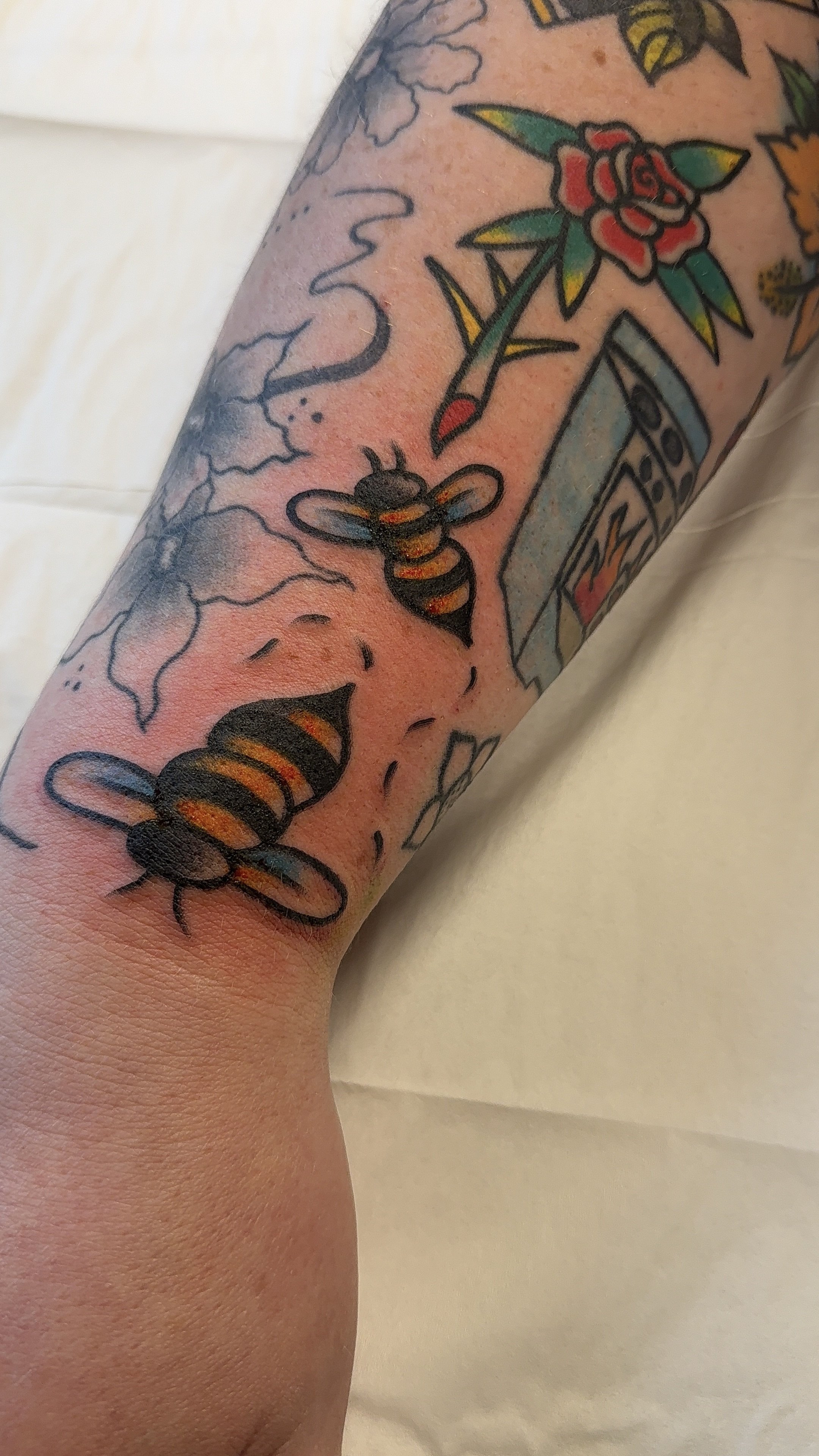Tattooed legs with bee and flower tattoos, lying on a medical examination table.