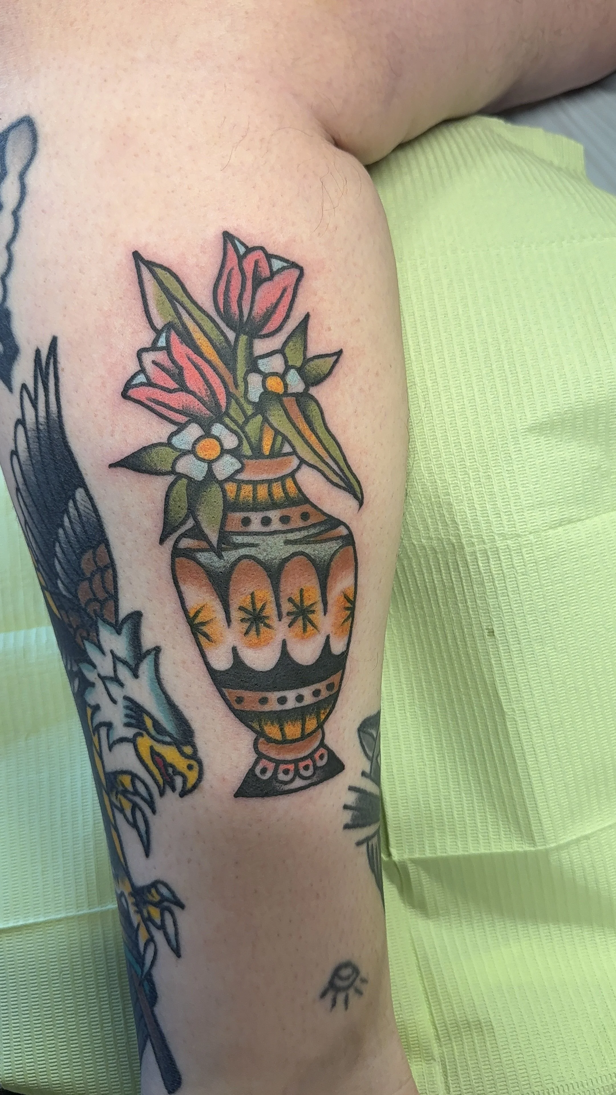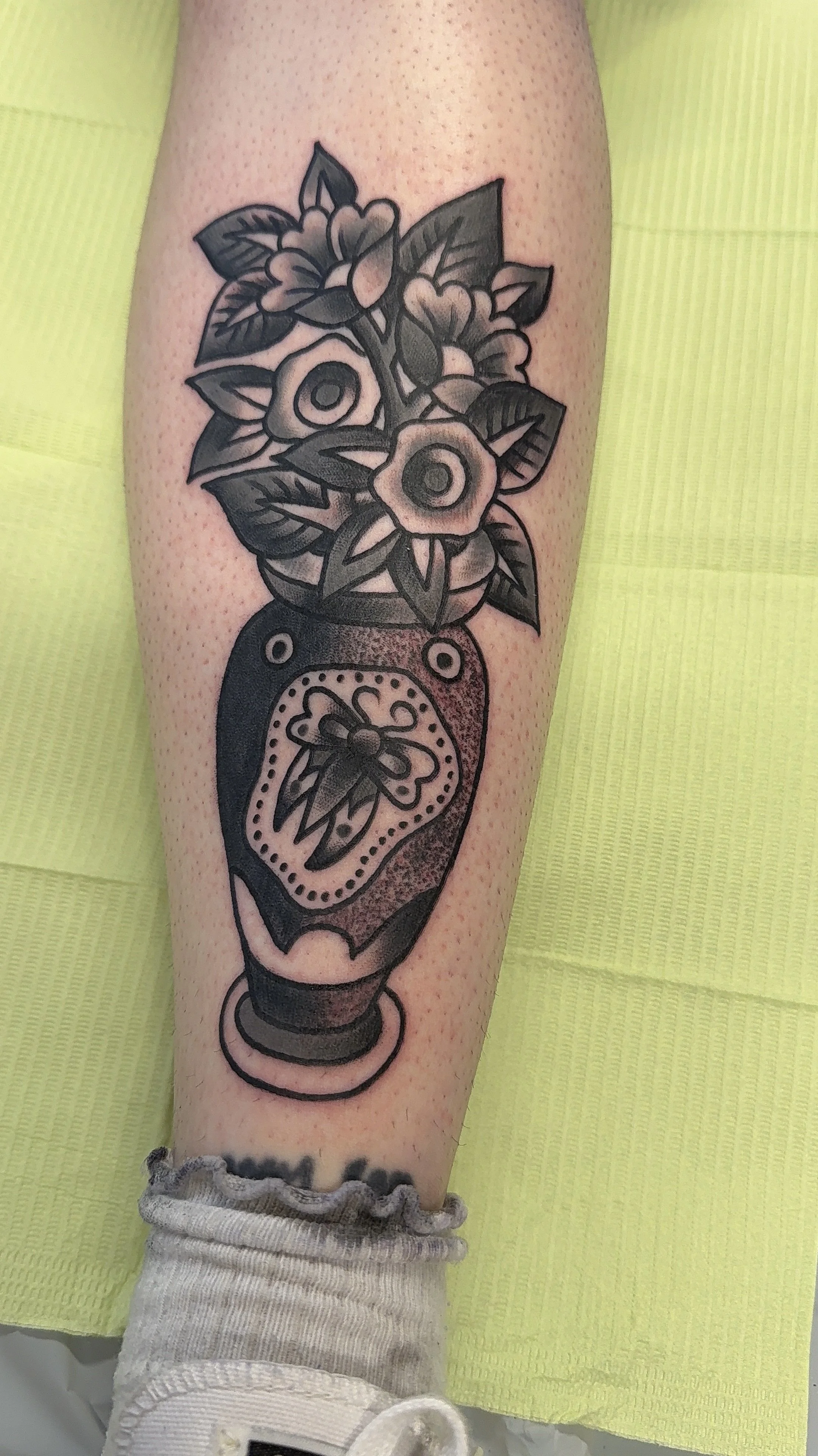 Tattoo of flowers in a vase with a Washington State ferry ship design