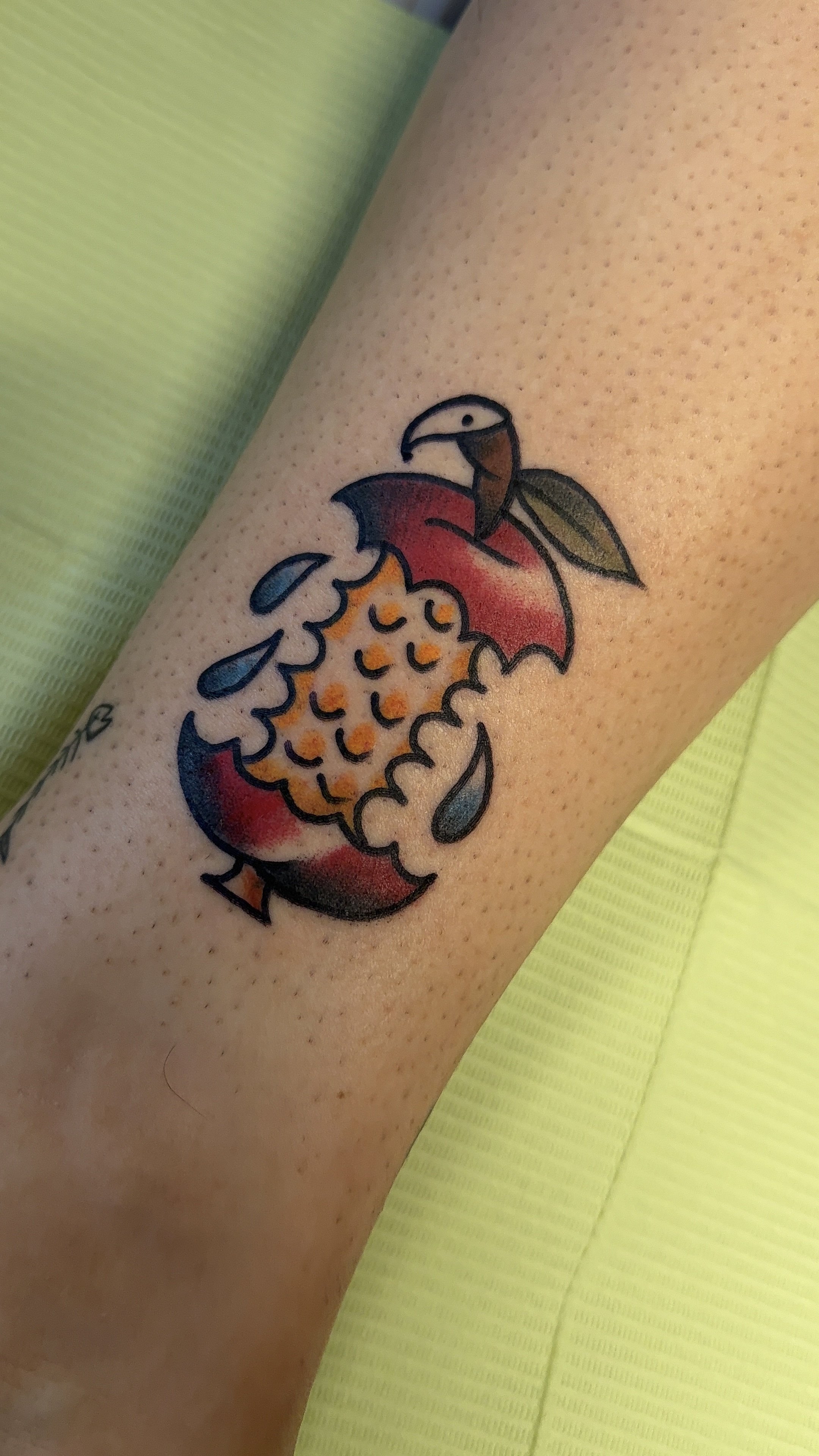 Tattoo of a lemon with leaves and stem, featuring vibrant colors, on a person's leg.