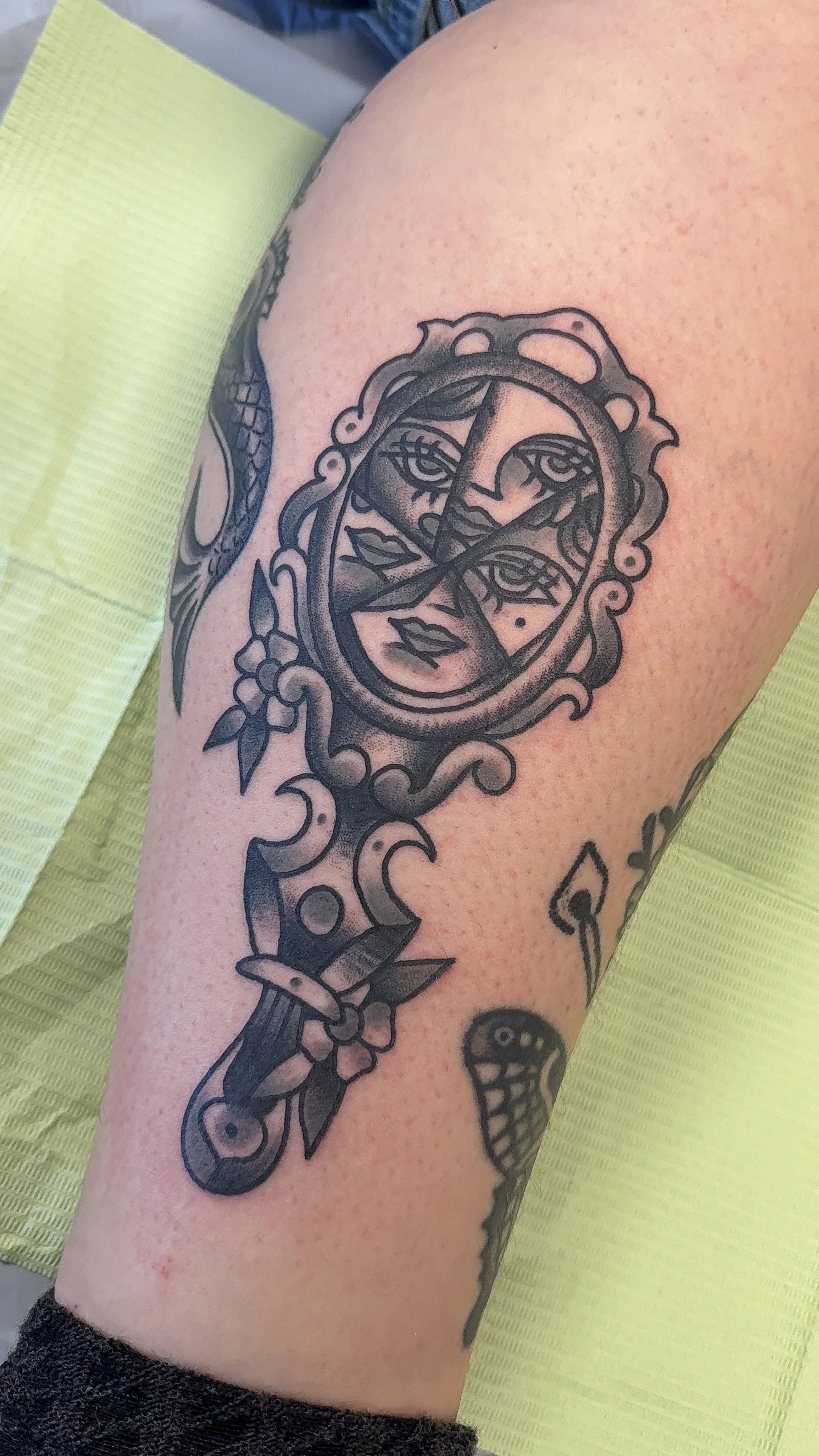 Tattoo of a bathroom vanity and mirror coverup on the client's wrist