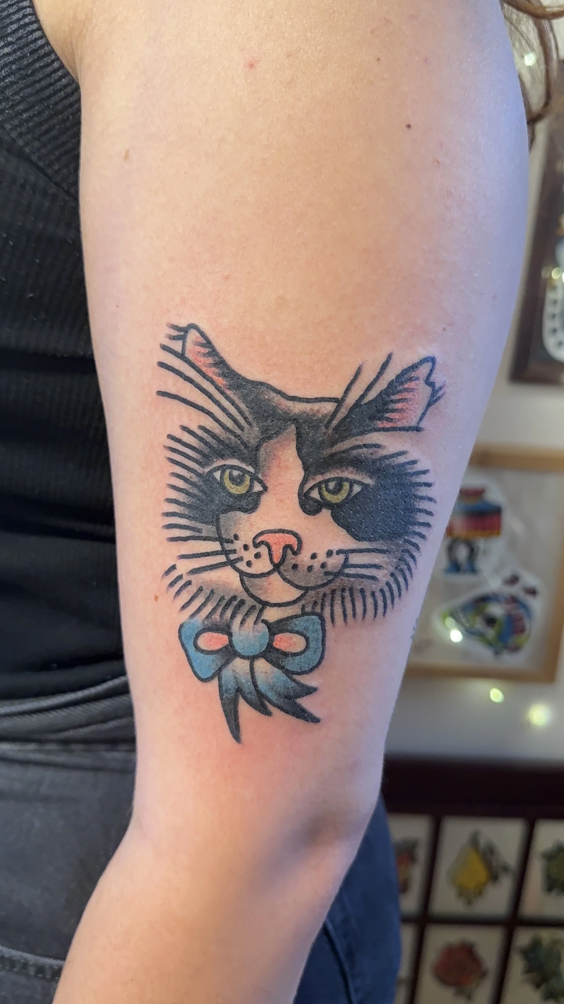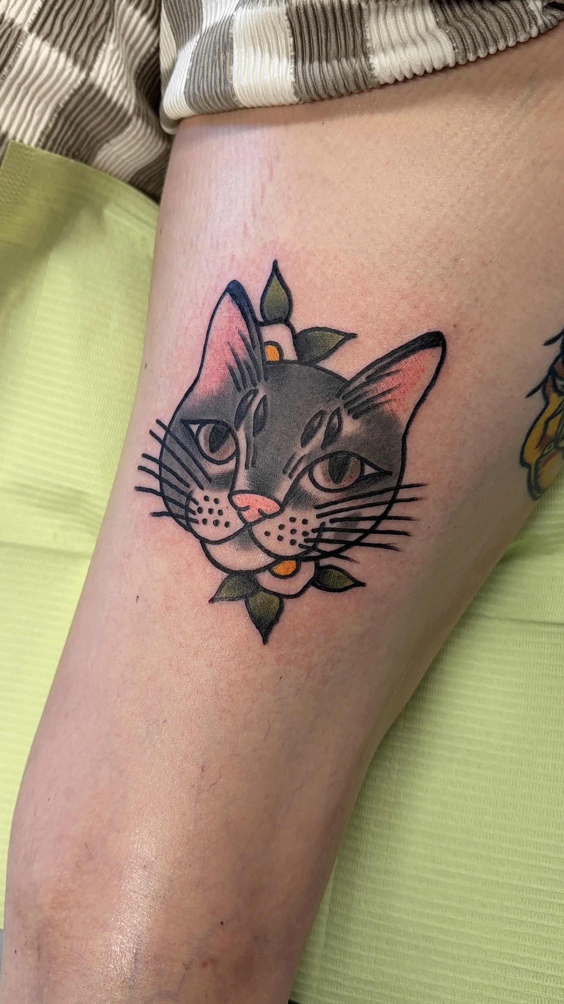 Tattoo of a cat head with flowers, based on client's pet cat.