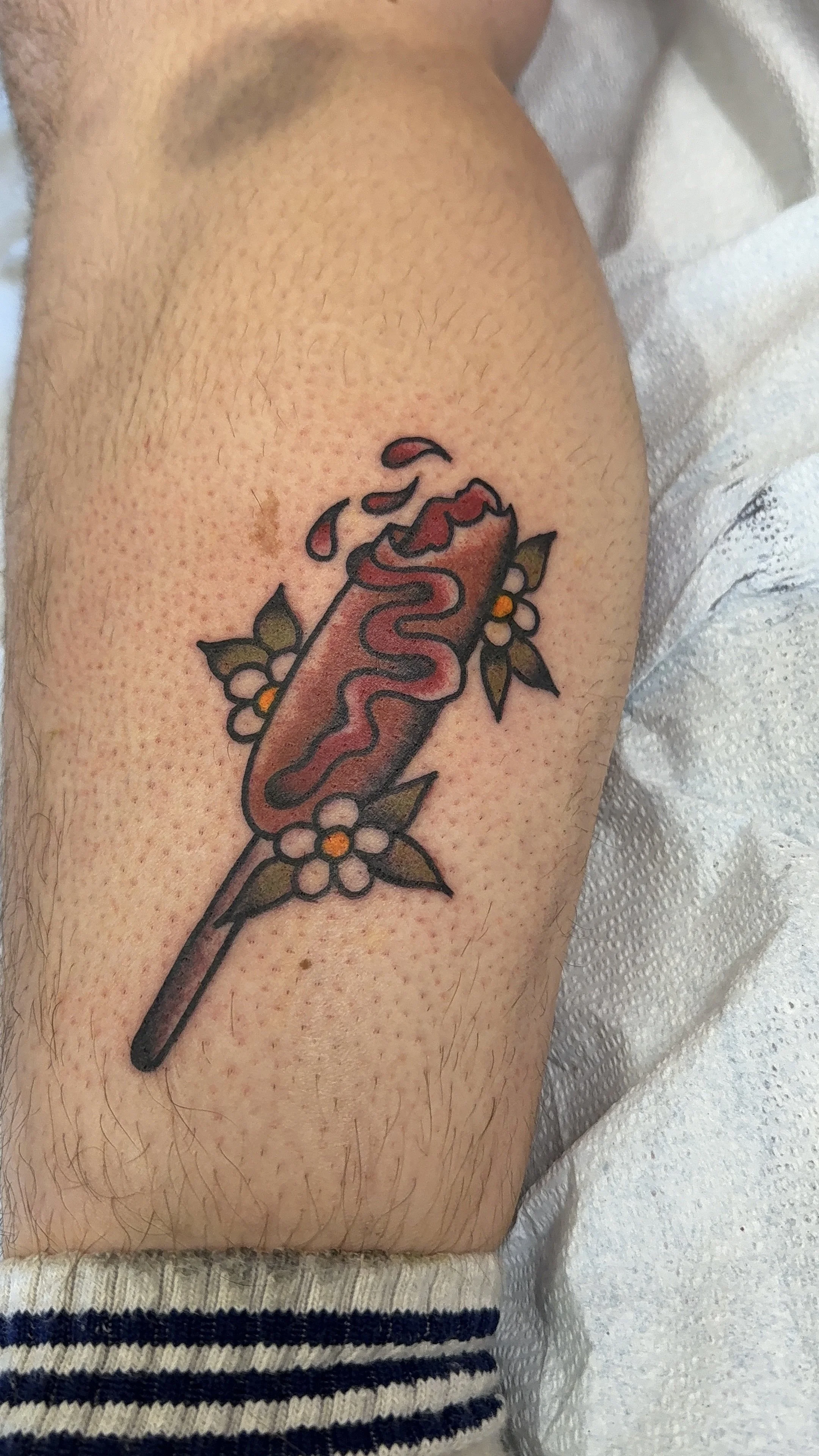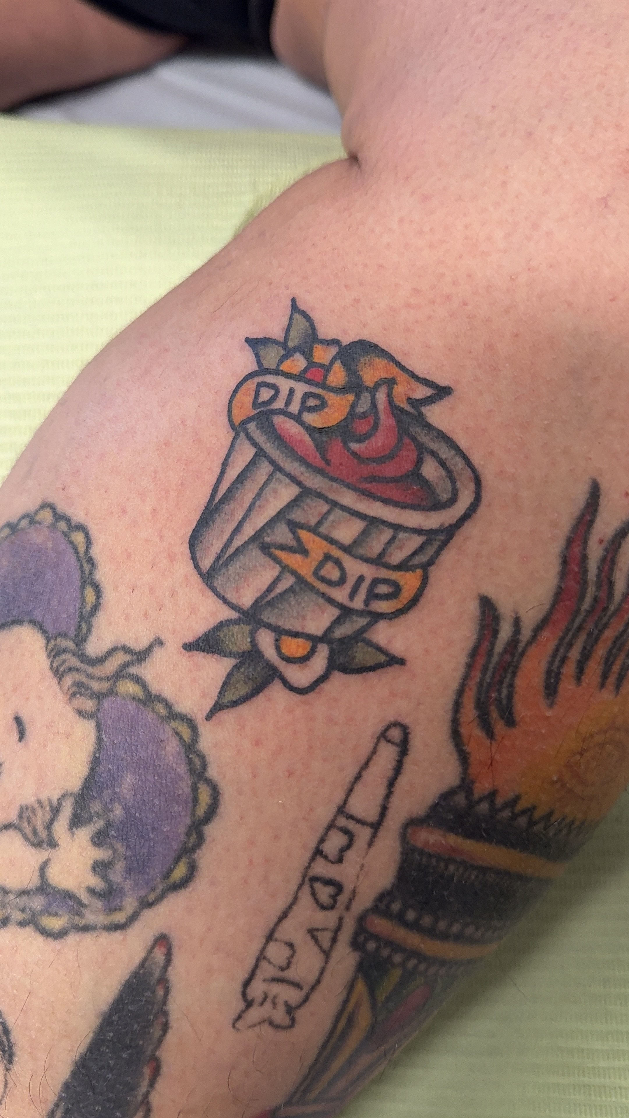 Person with tattoos on upper arm, including a colorful pizza slice with toppings including black olives and cheese.