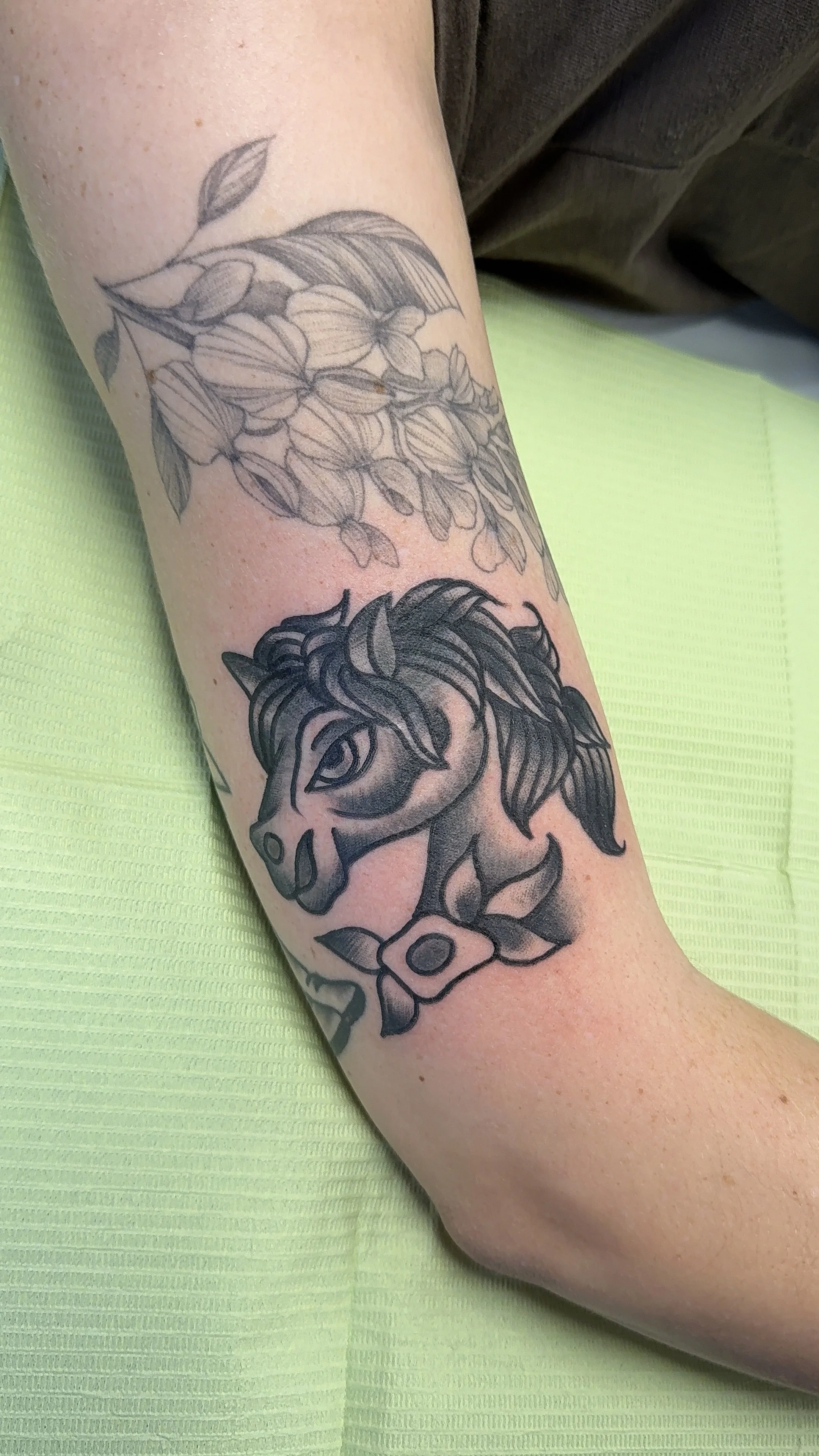 American Traditional cowgirl horseshoe tattoo in black and grey