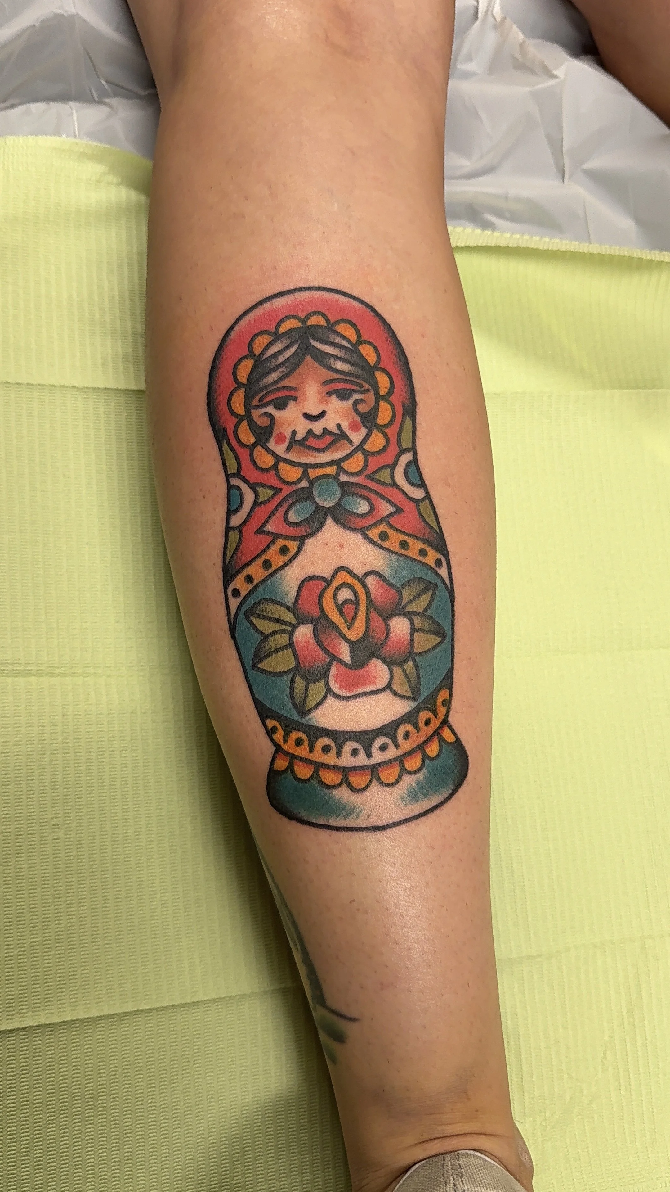 Tattoo of a cartoon girl with pigtails and a dress on a person's leg.