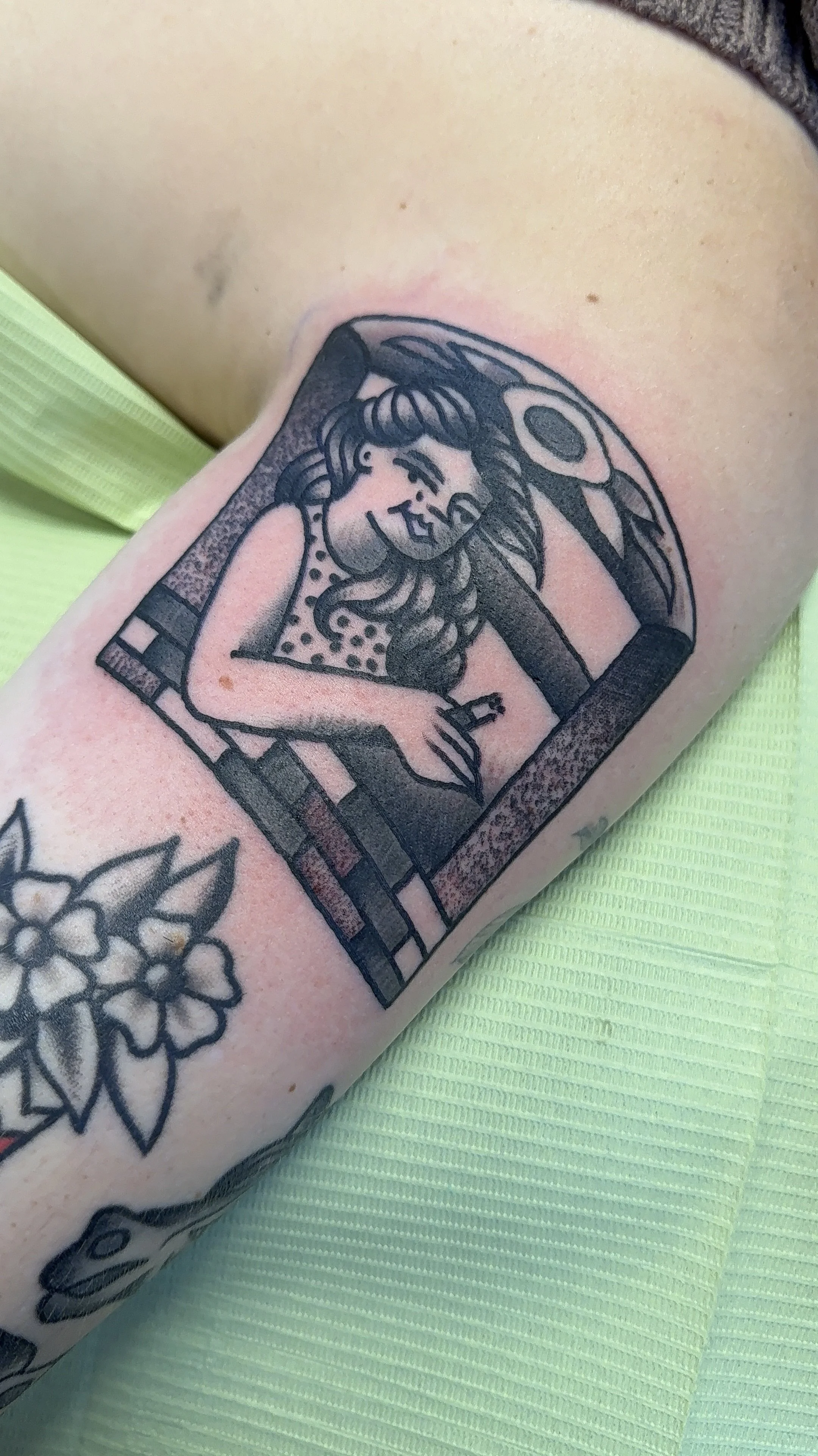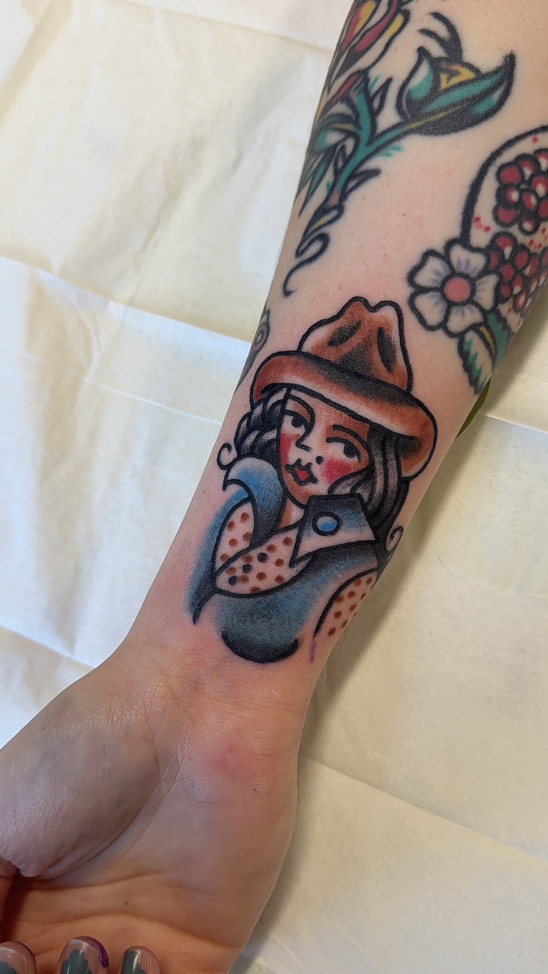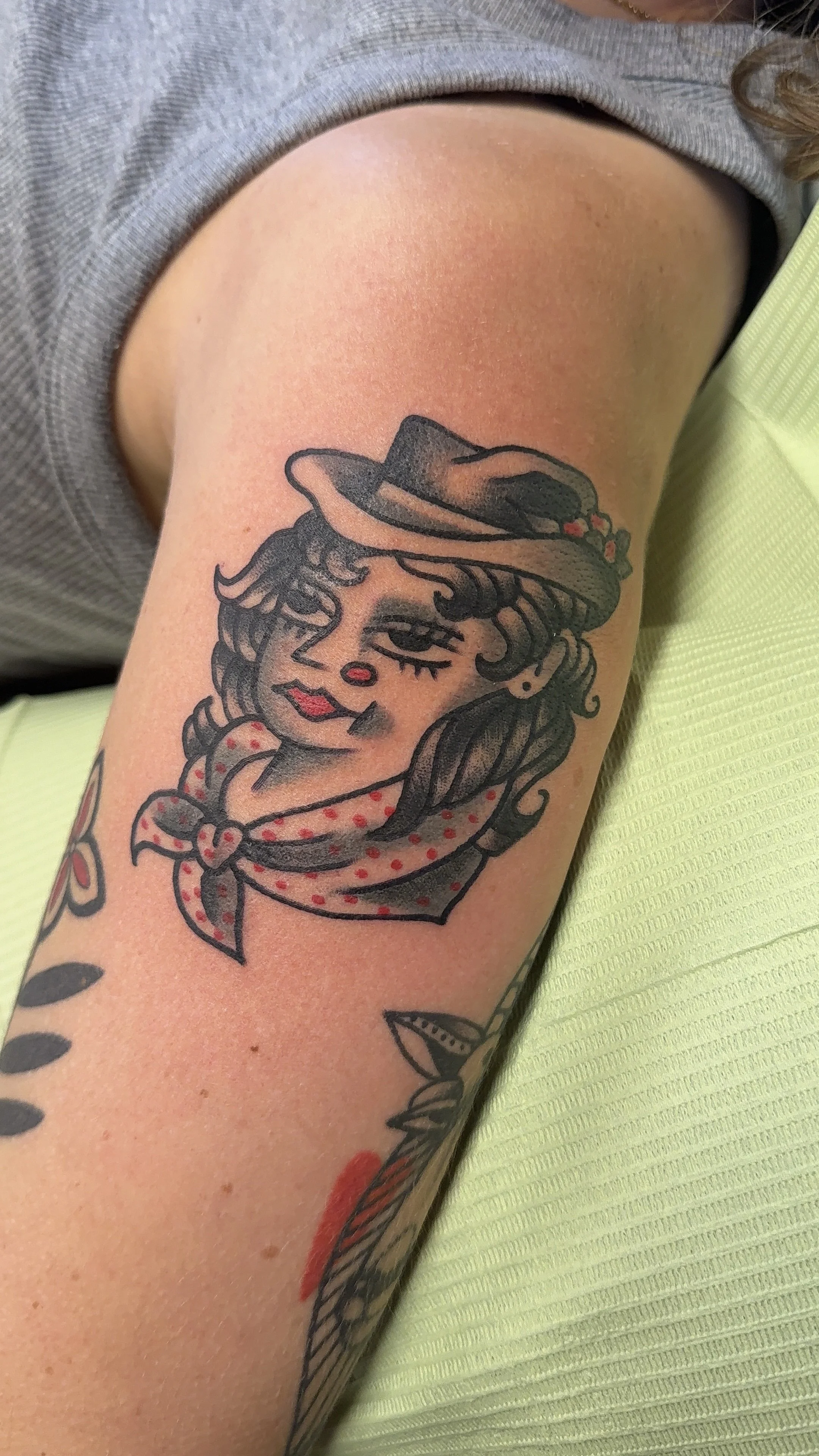 Black and grey with a pop of red American Traditional cowgirl tattoo
