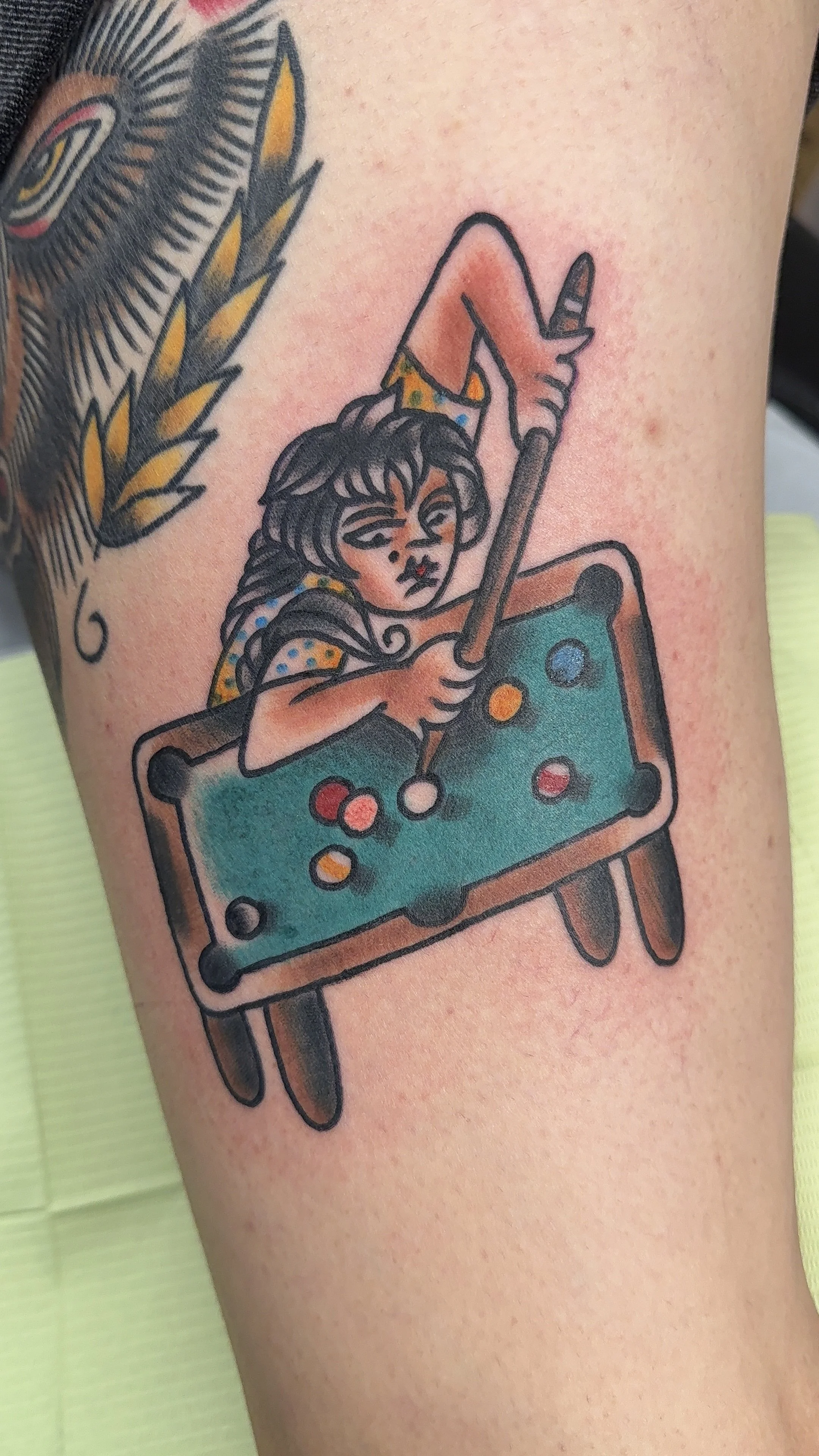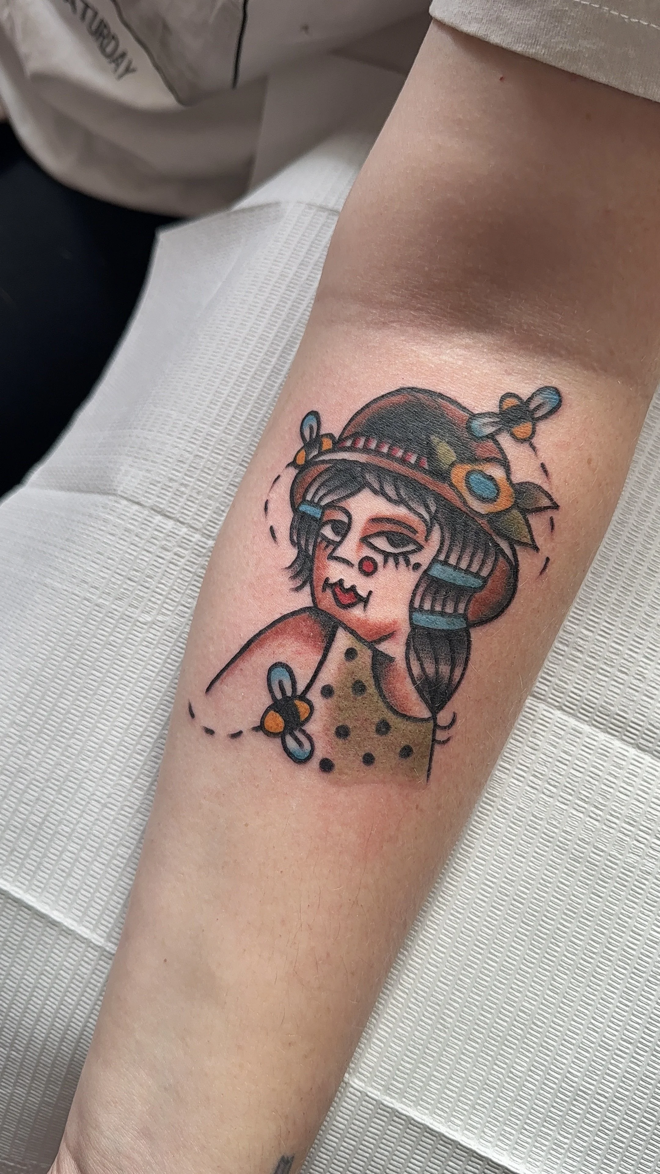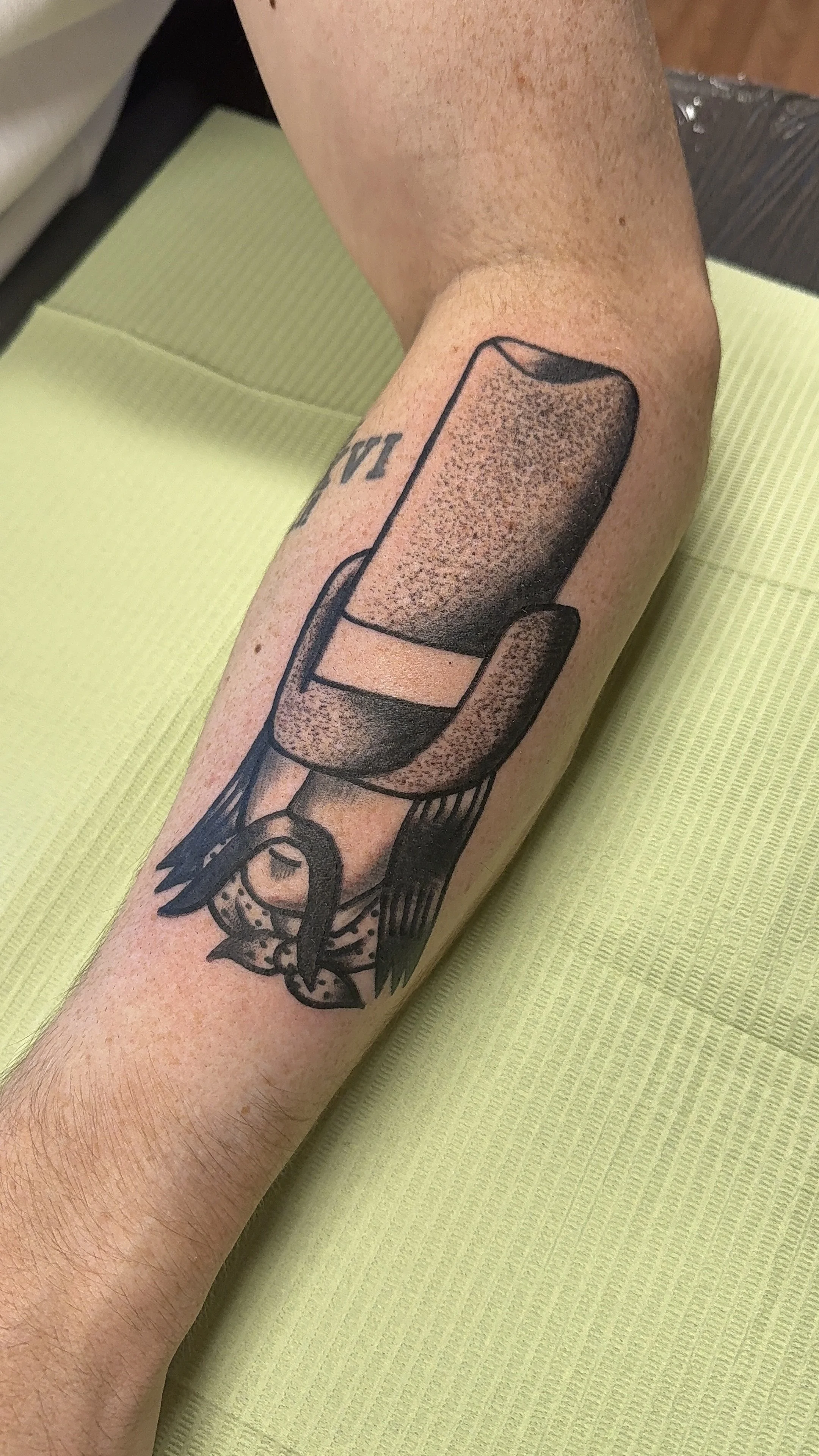 Black and grey with a pop of red American Traditional cowgirl tattoo