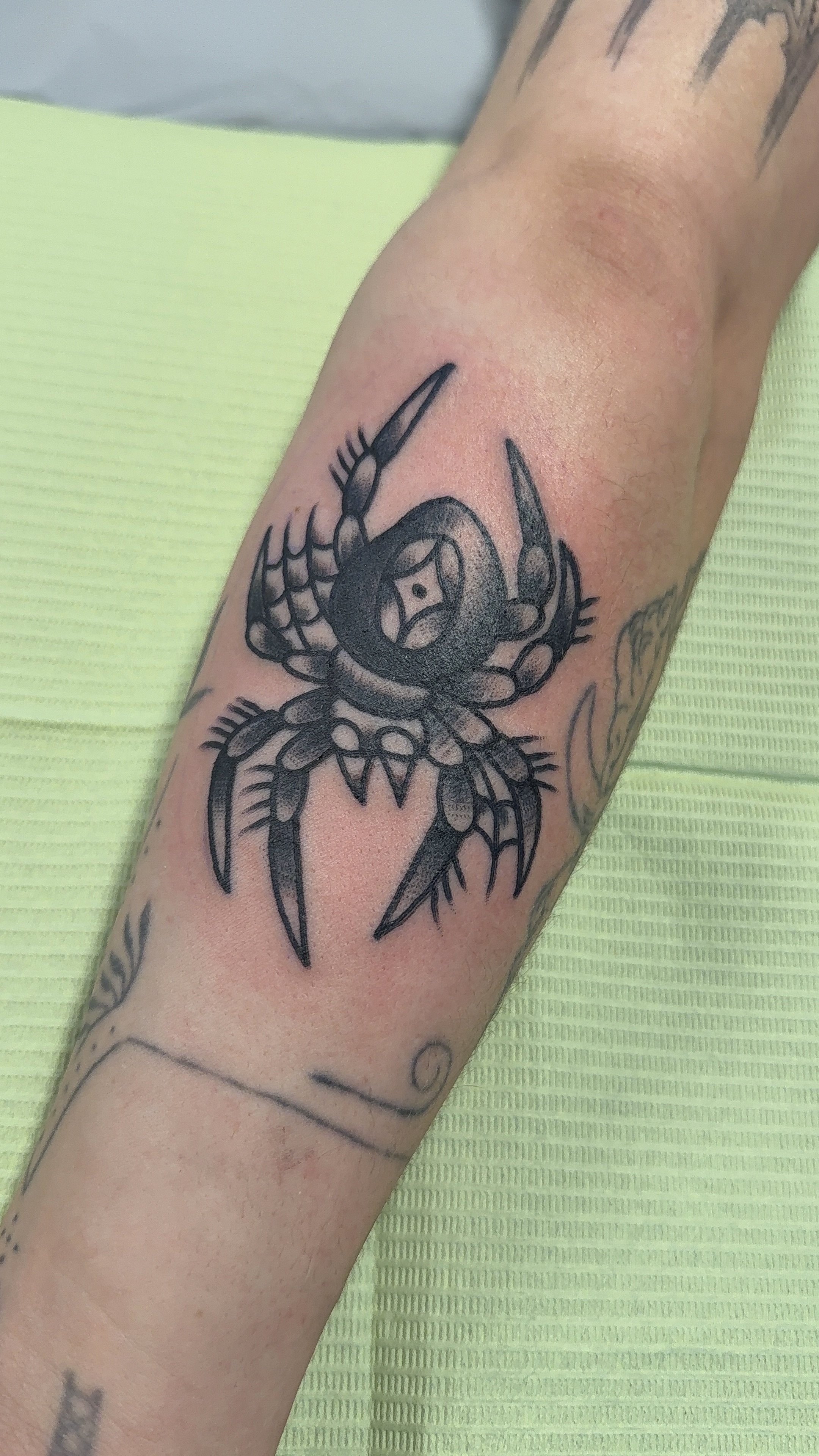 Tattoo featuring a crescent moon with a face, a spider hanging from it, and stars.