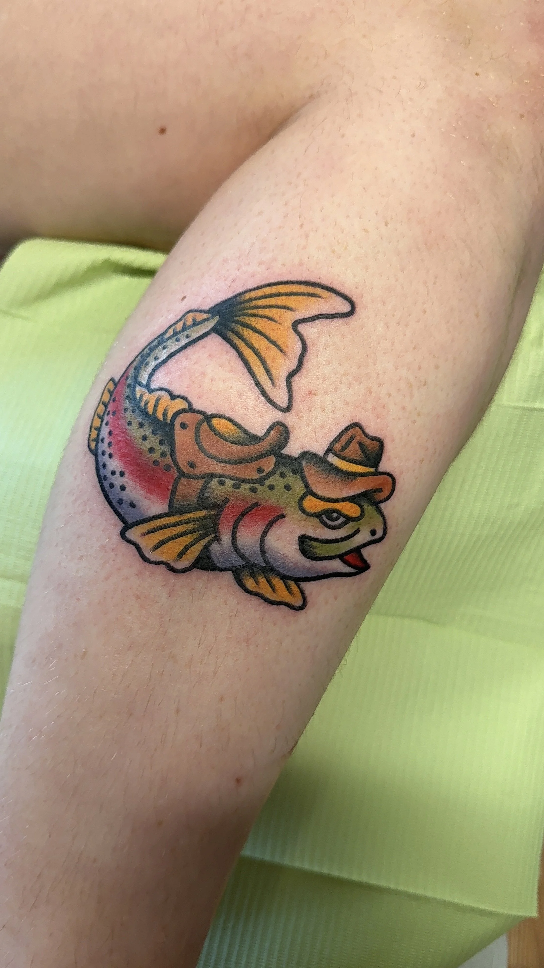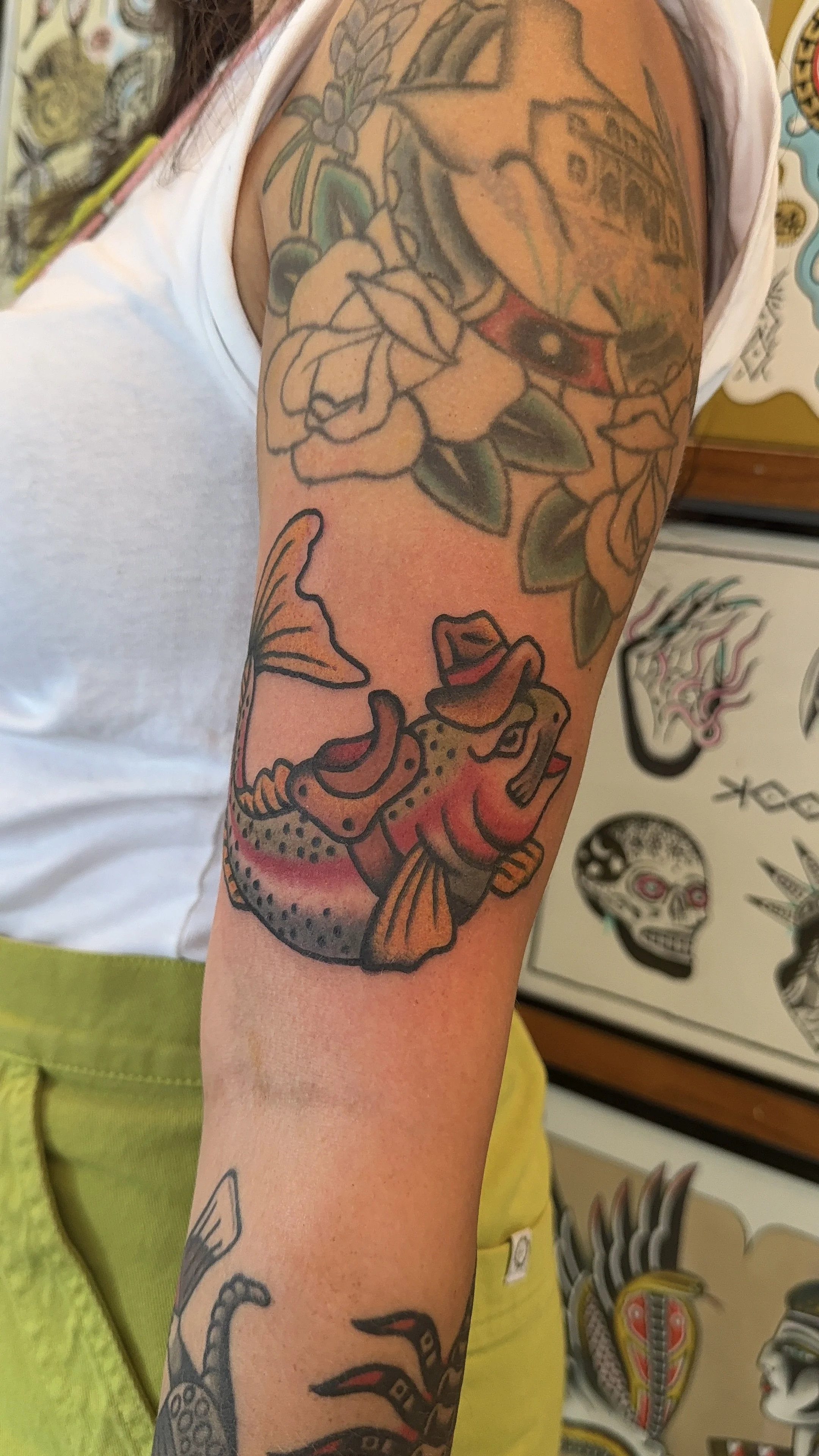 American Traditional color cowboy fish tatoo with cowboy hat and saddle