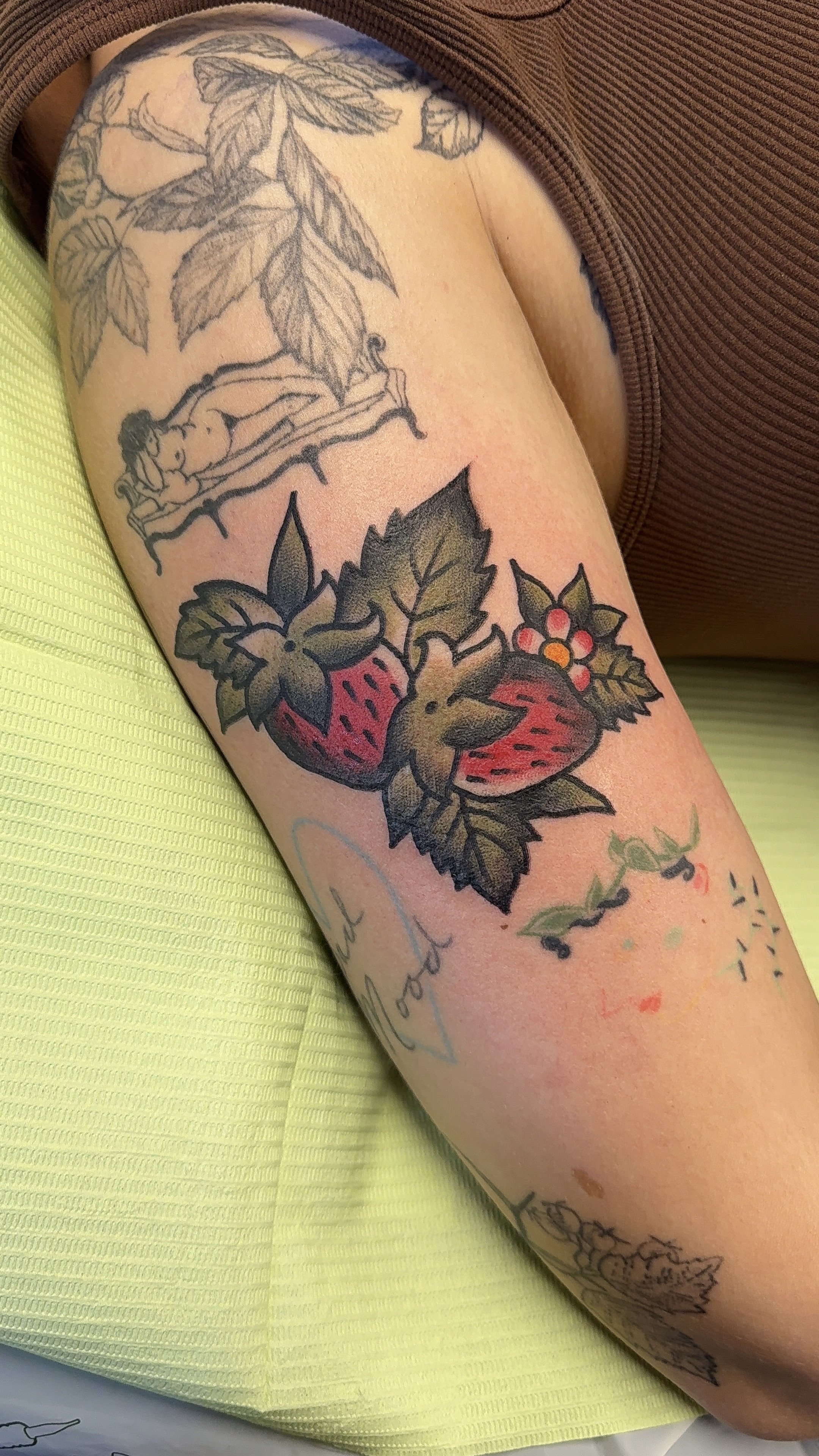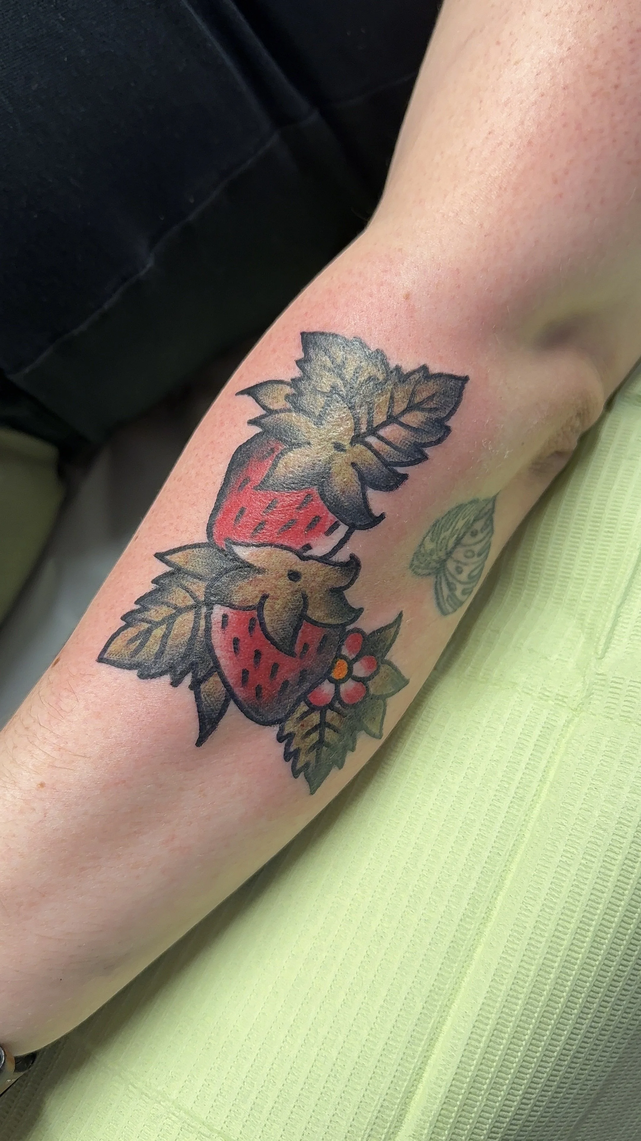 Tattoo of hand holding strawberries in black and grey on a forearm