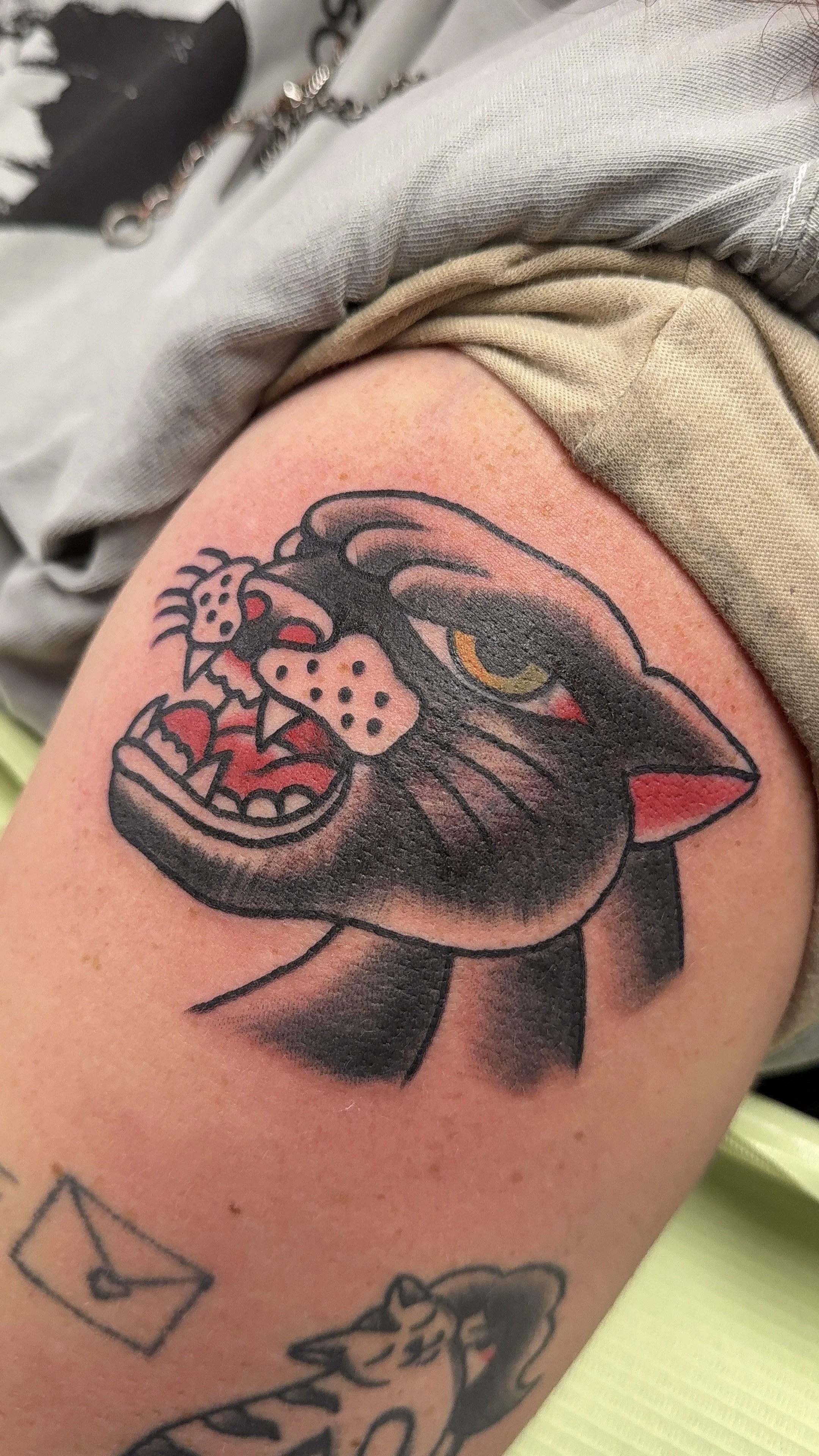 Tattoo of a black panther head with 'I Bite Back' text and a scorpion tattoo on skin.