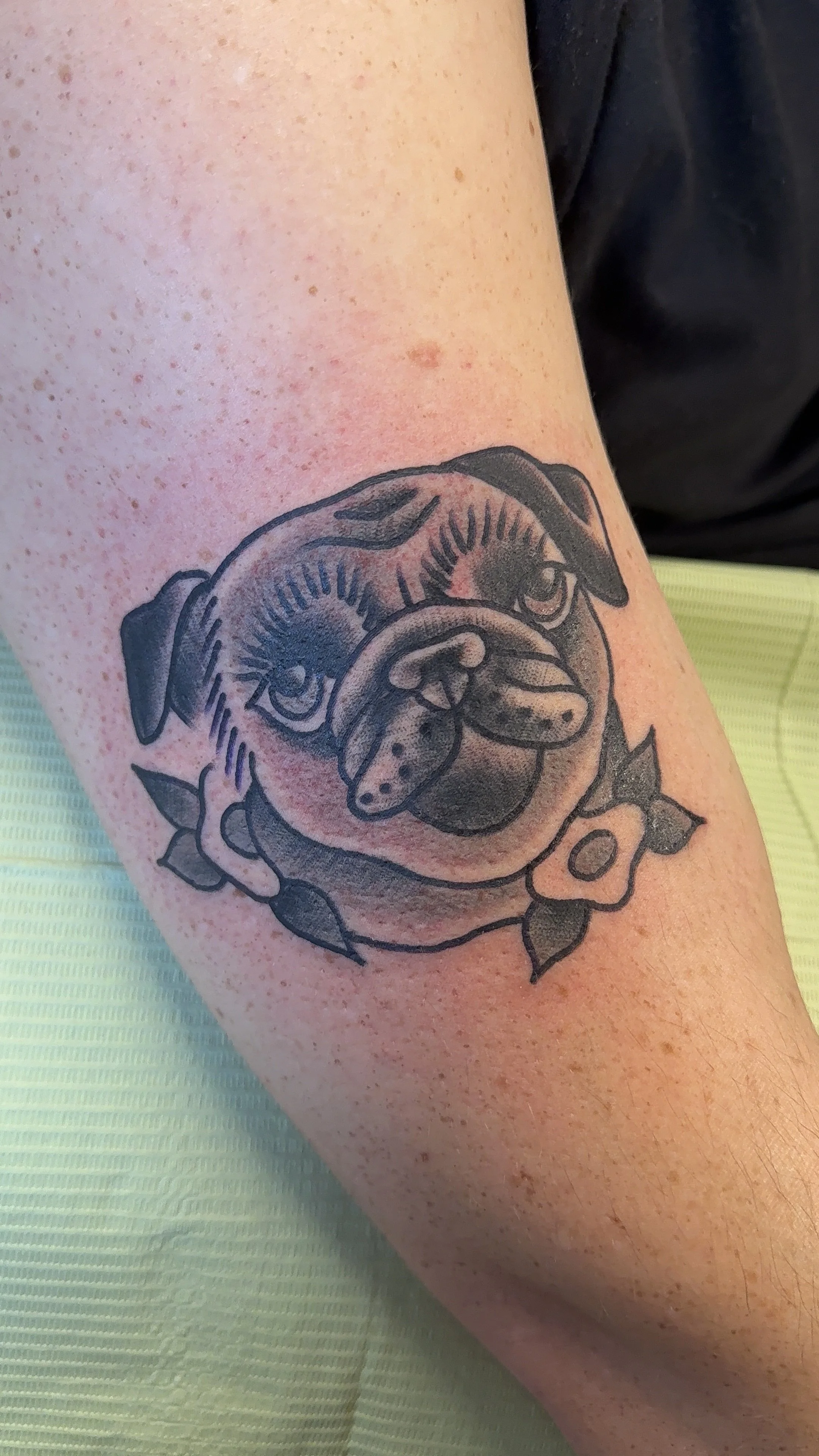 Tattoo of a dog's head with flowers on an arm based on client's pet.