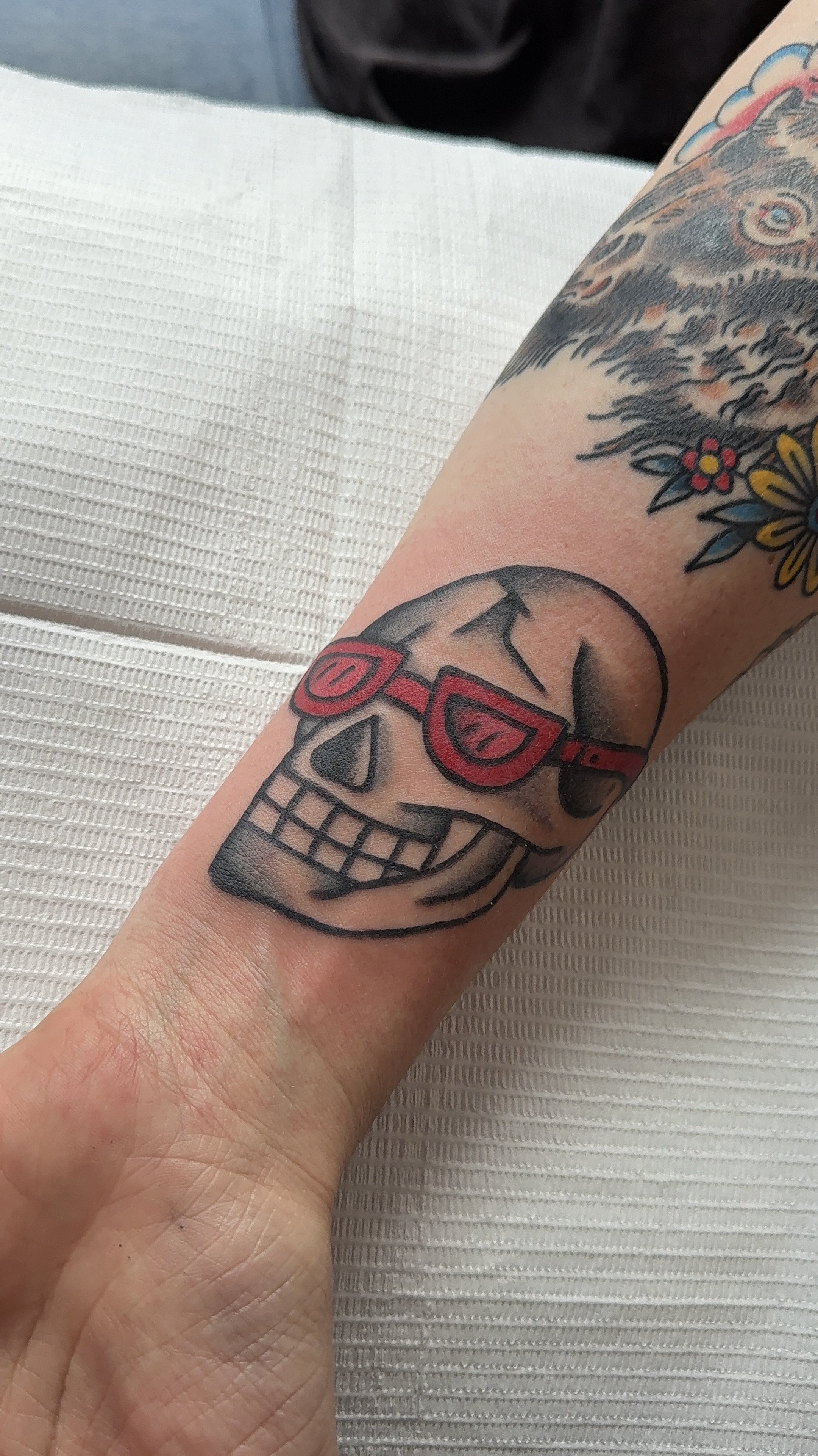 American Traditional skull tattoo with rose colored glasses Paramore tattoo