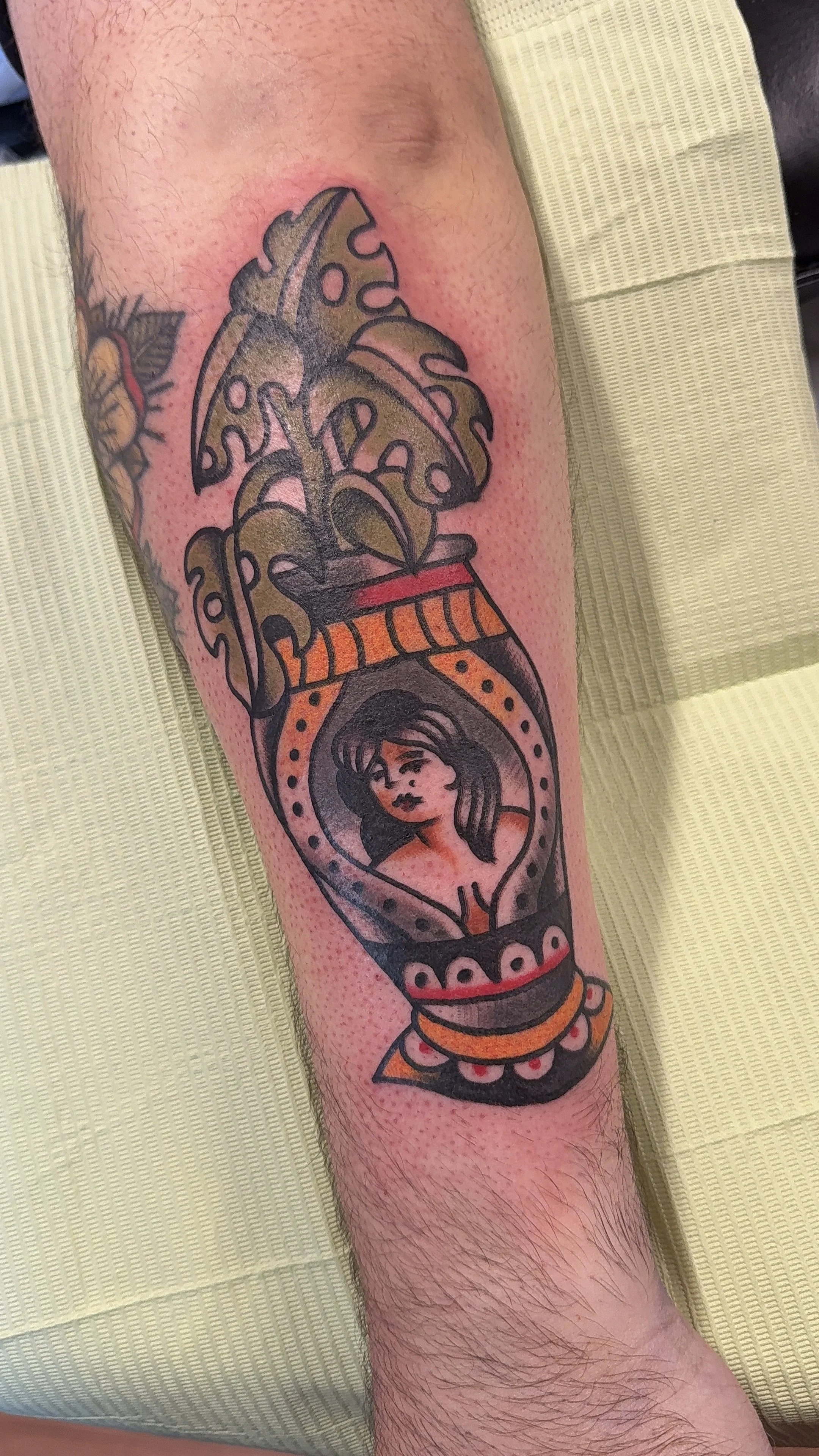American Traditional  monstera houseplant leaf tattoo in a colorful vase featuring a woman
