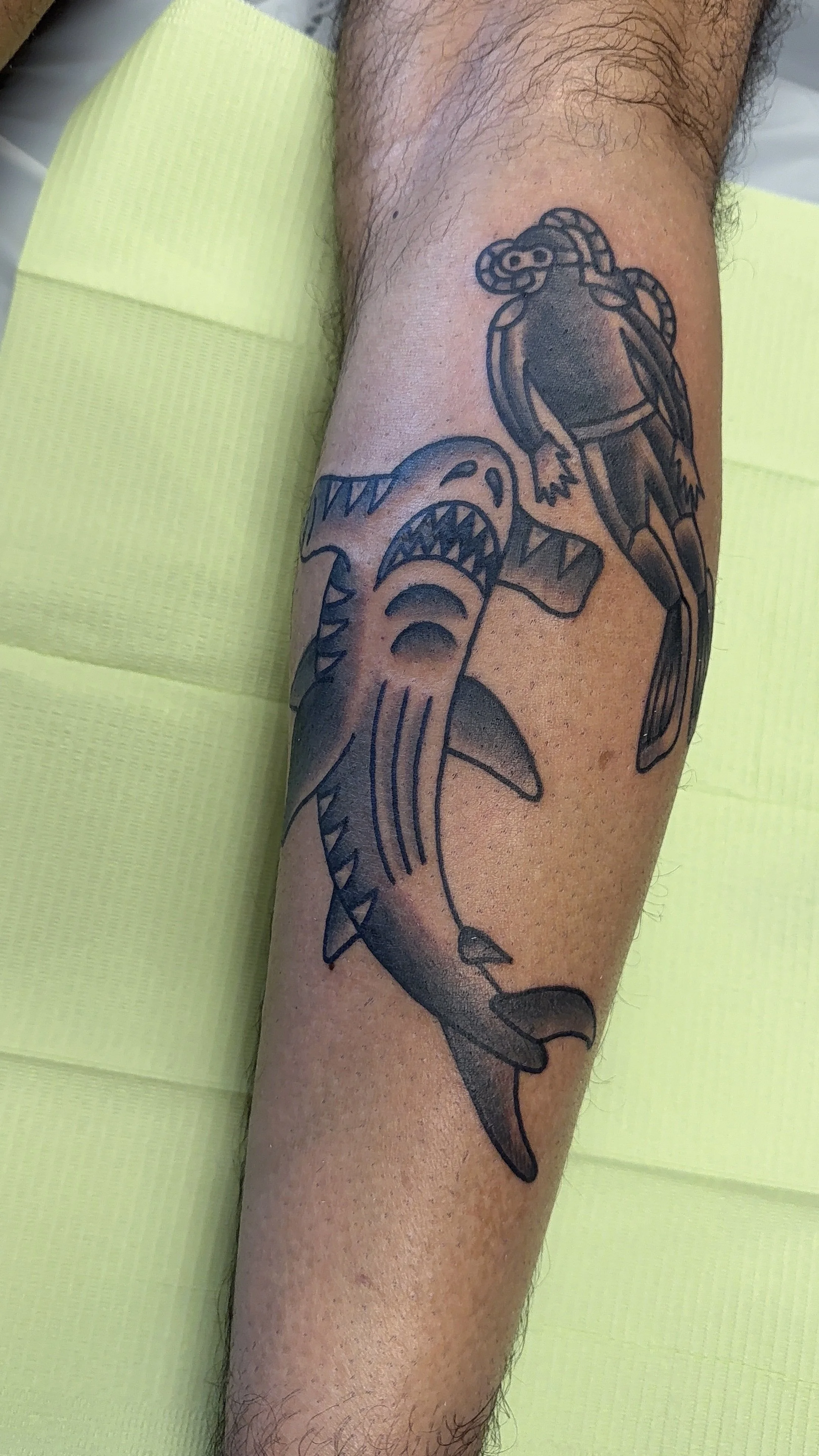 American Traditional black and grey scuba diver and hammerhead shark tattoo on calf