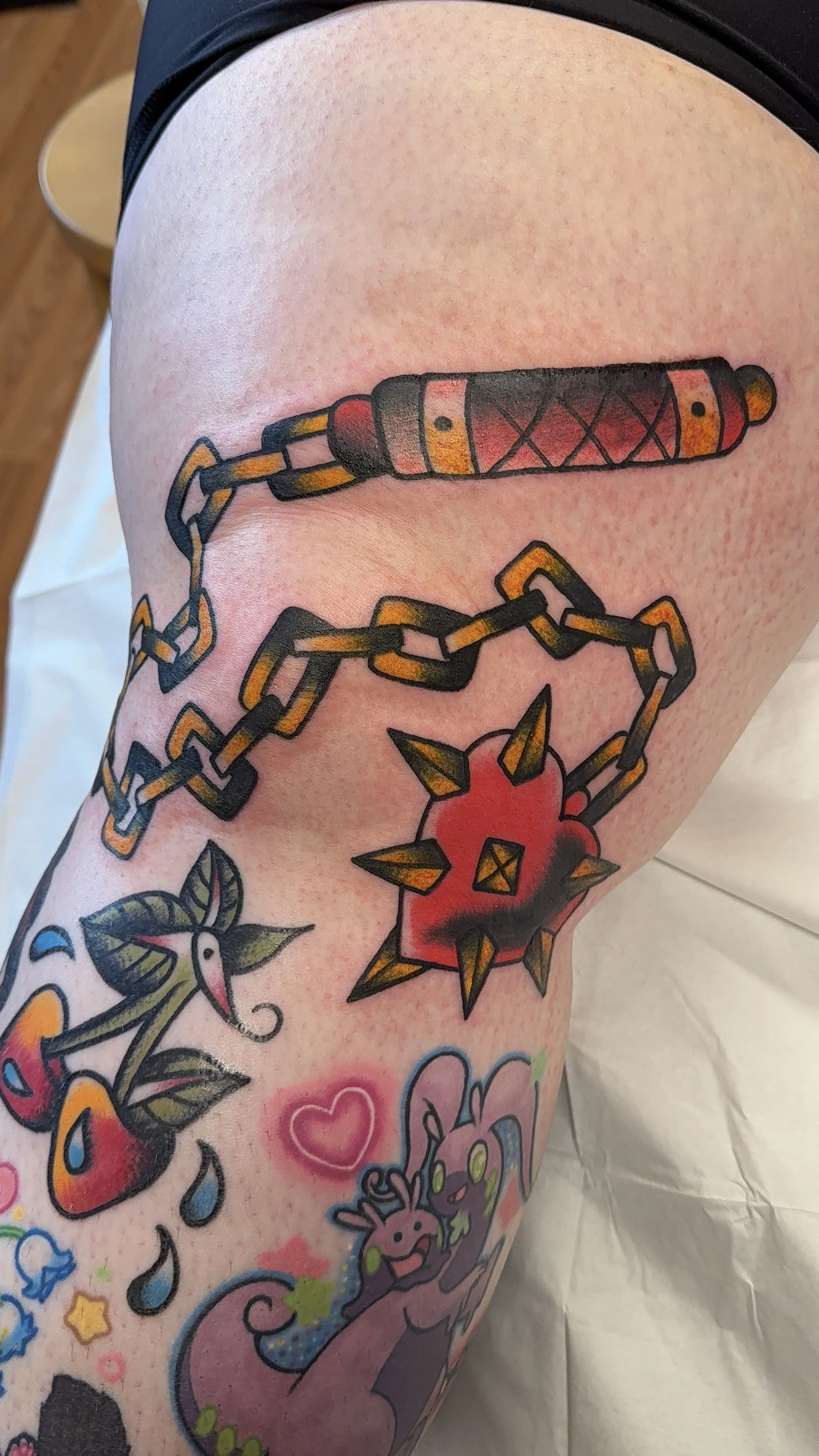 Tattoo of a medieval mace with spikes, a chain, and a handle on a person's skin.