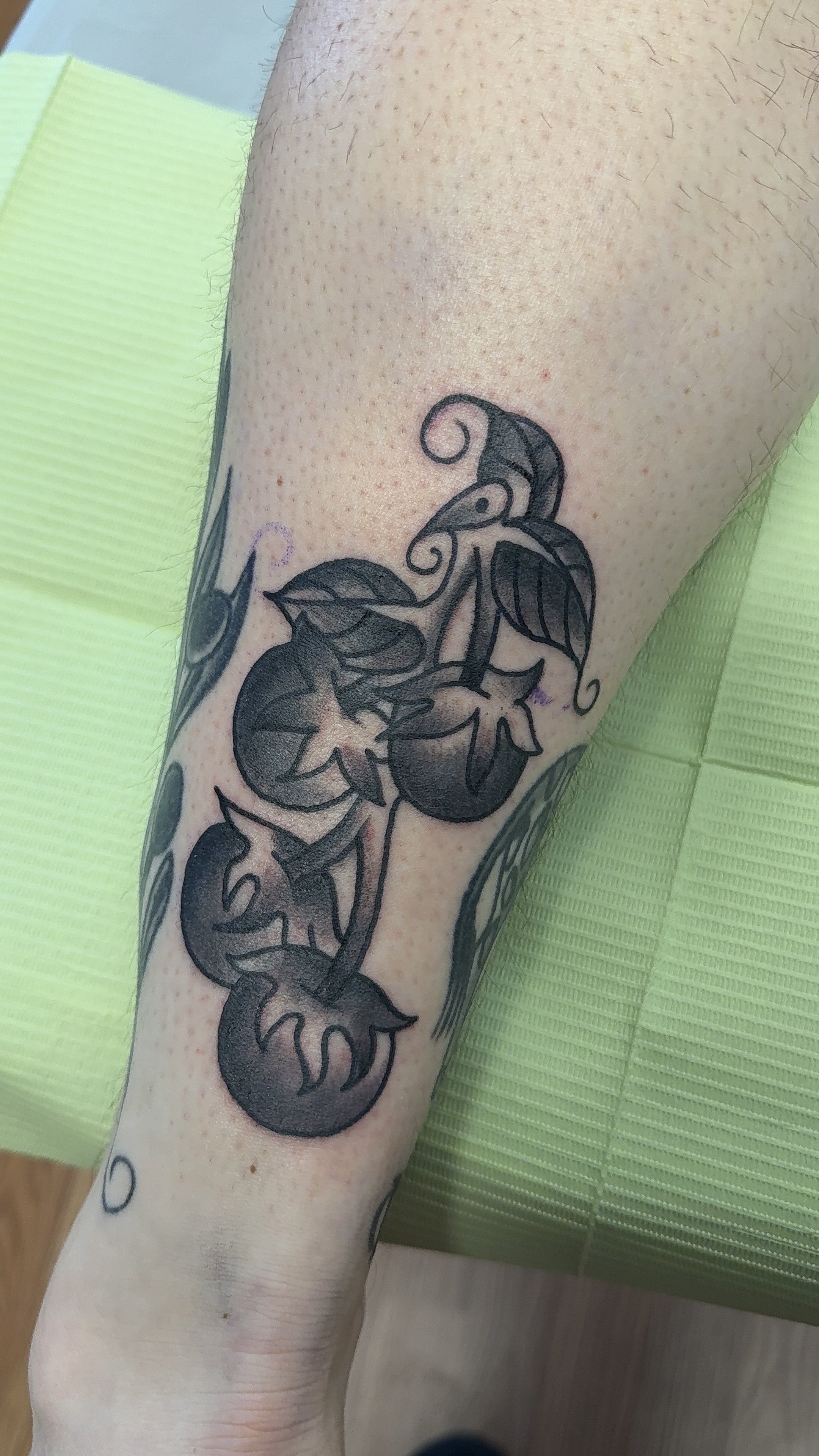 Tattoo of a branch with green leaves and red berries on a person's forearm.
