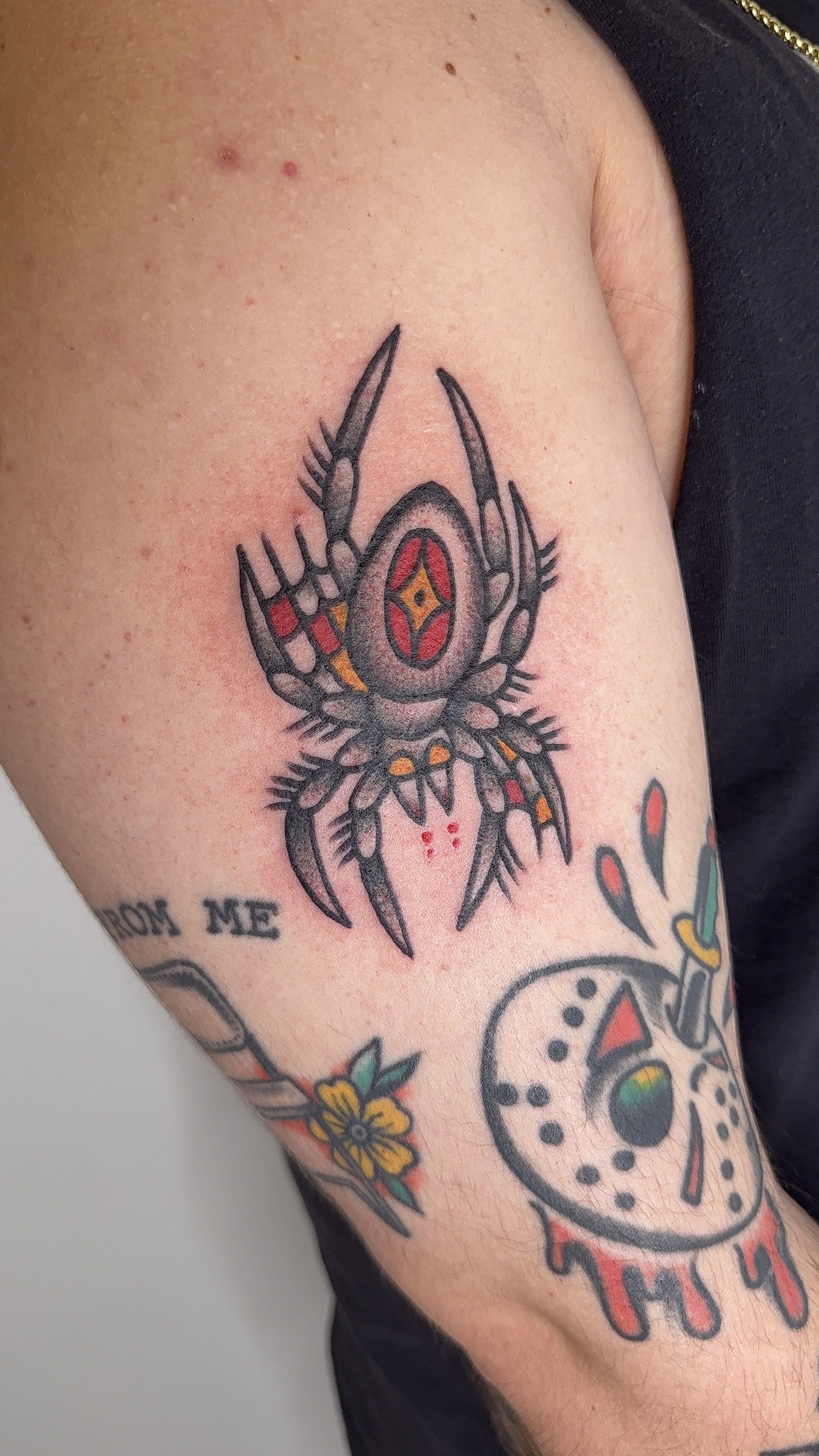 Tattoo of a cartoon devil holding a banner with the words 'SEE YA!', with a flower and other colorful characters around.