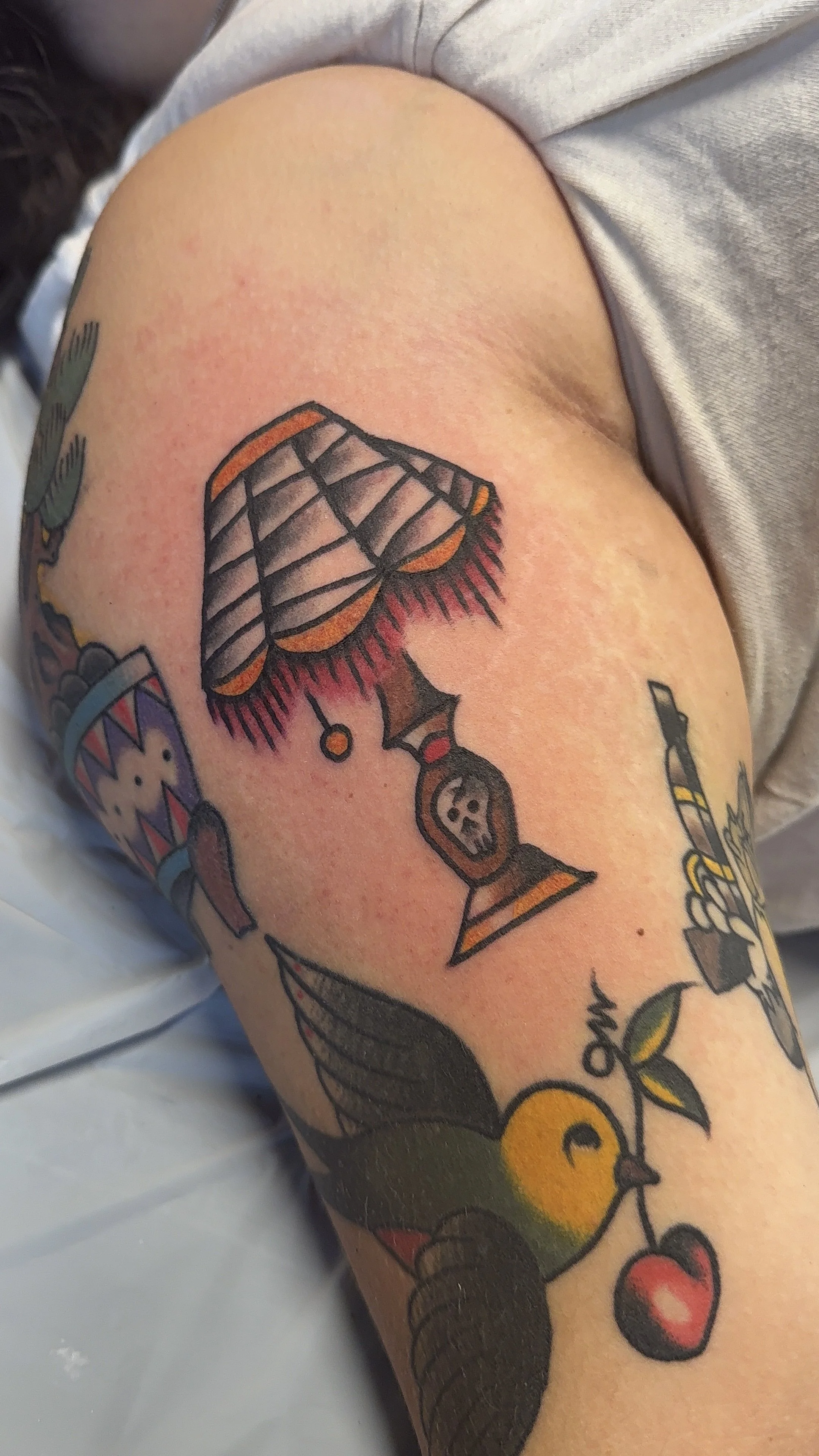Tattoo of a vintage table lamp on a person's arm, featuring decorative design elements and other nearby tattoos.