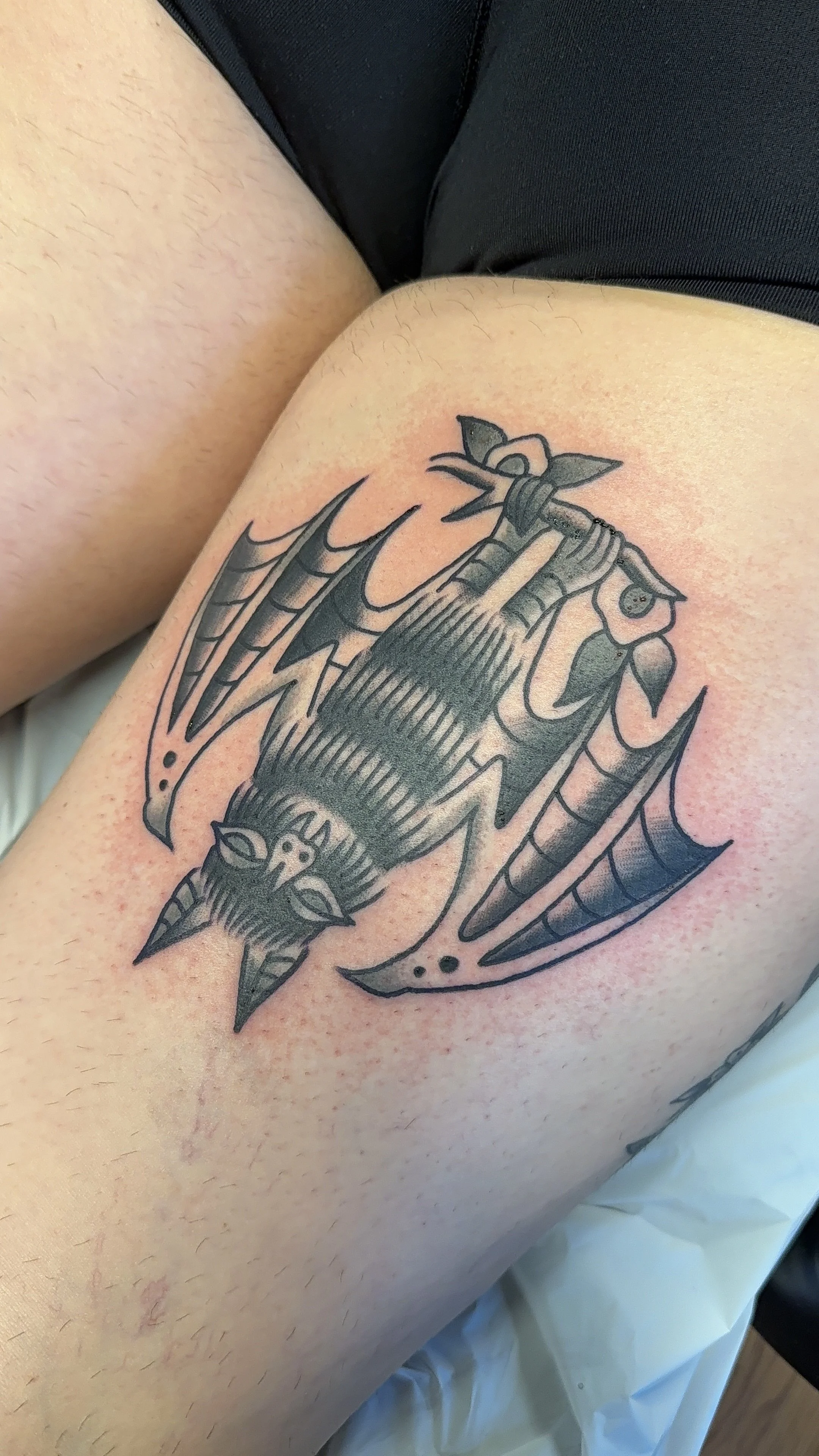 American Traditional black and grey bat tattoo hanging from branch back of leg hamstring tattoo