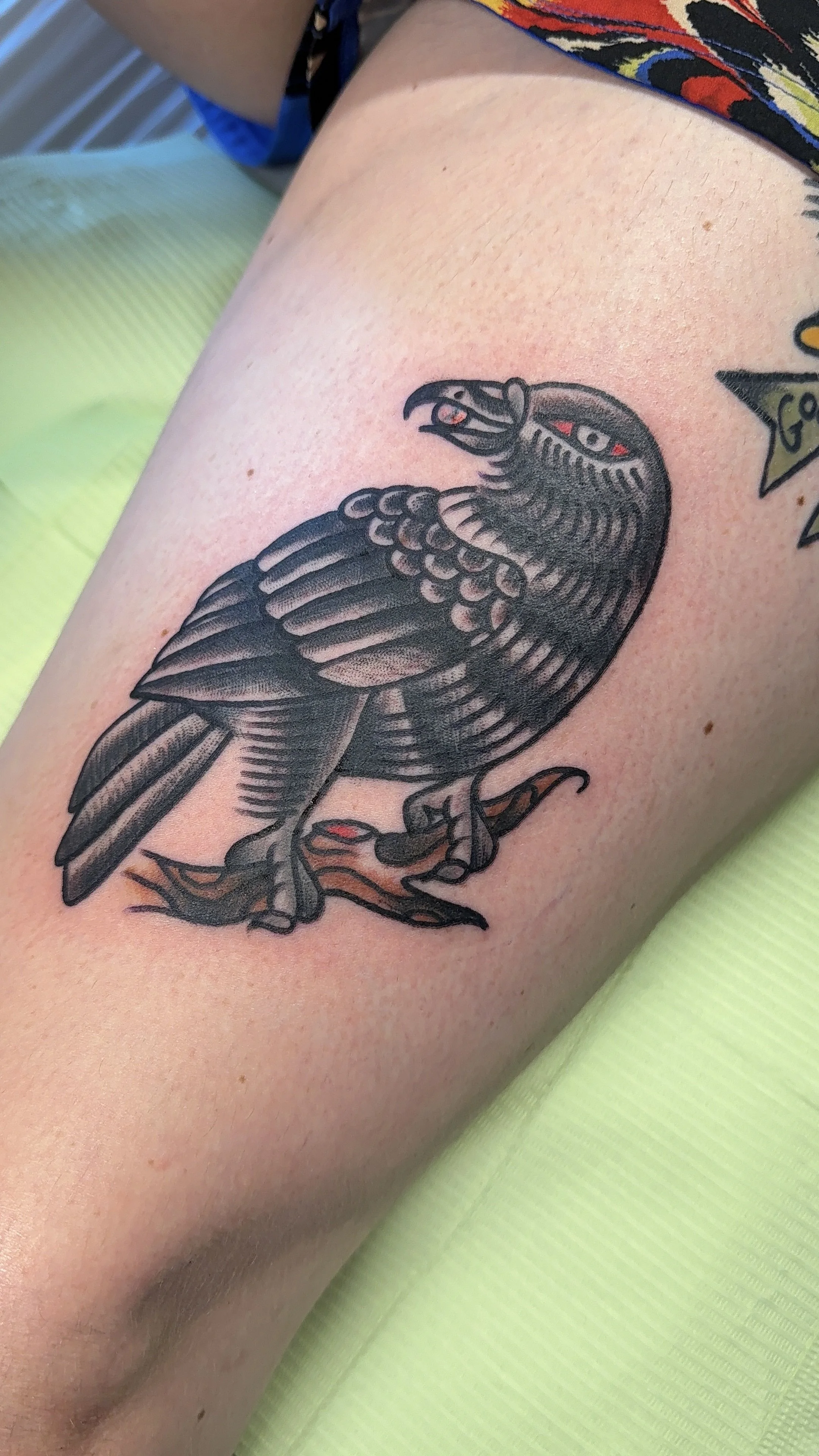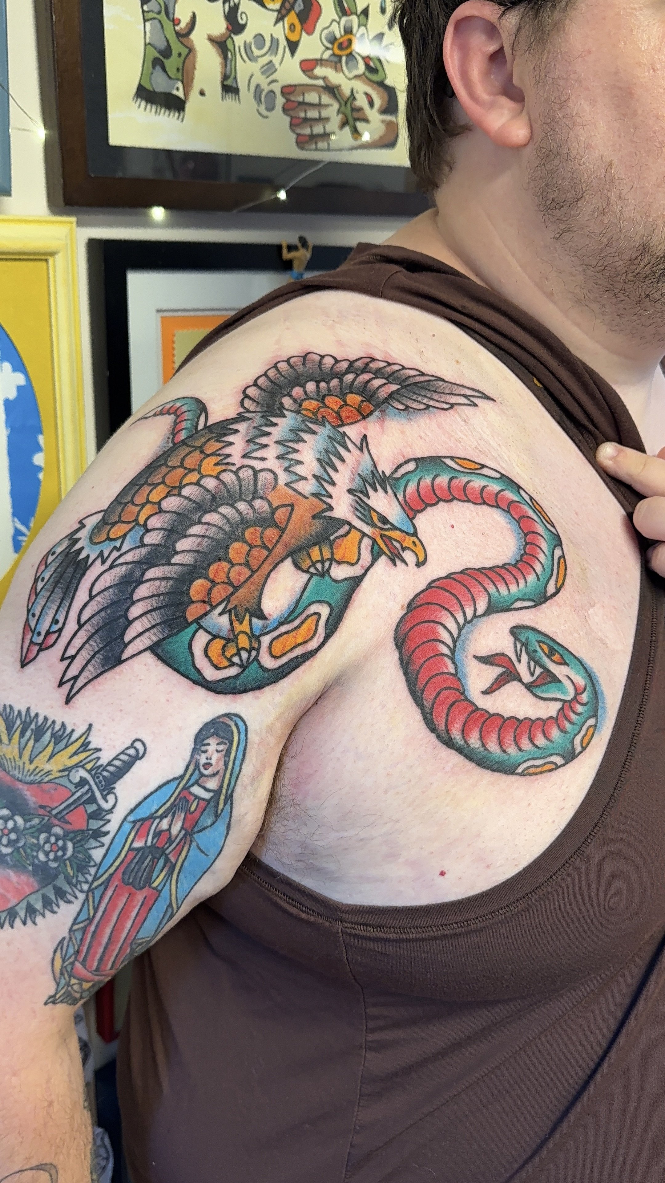 American Traditional color tattoo of classic eagle fighting a snake shoulder tattoo