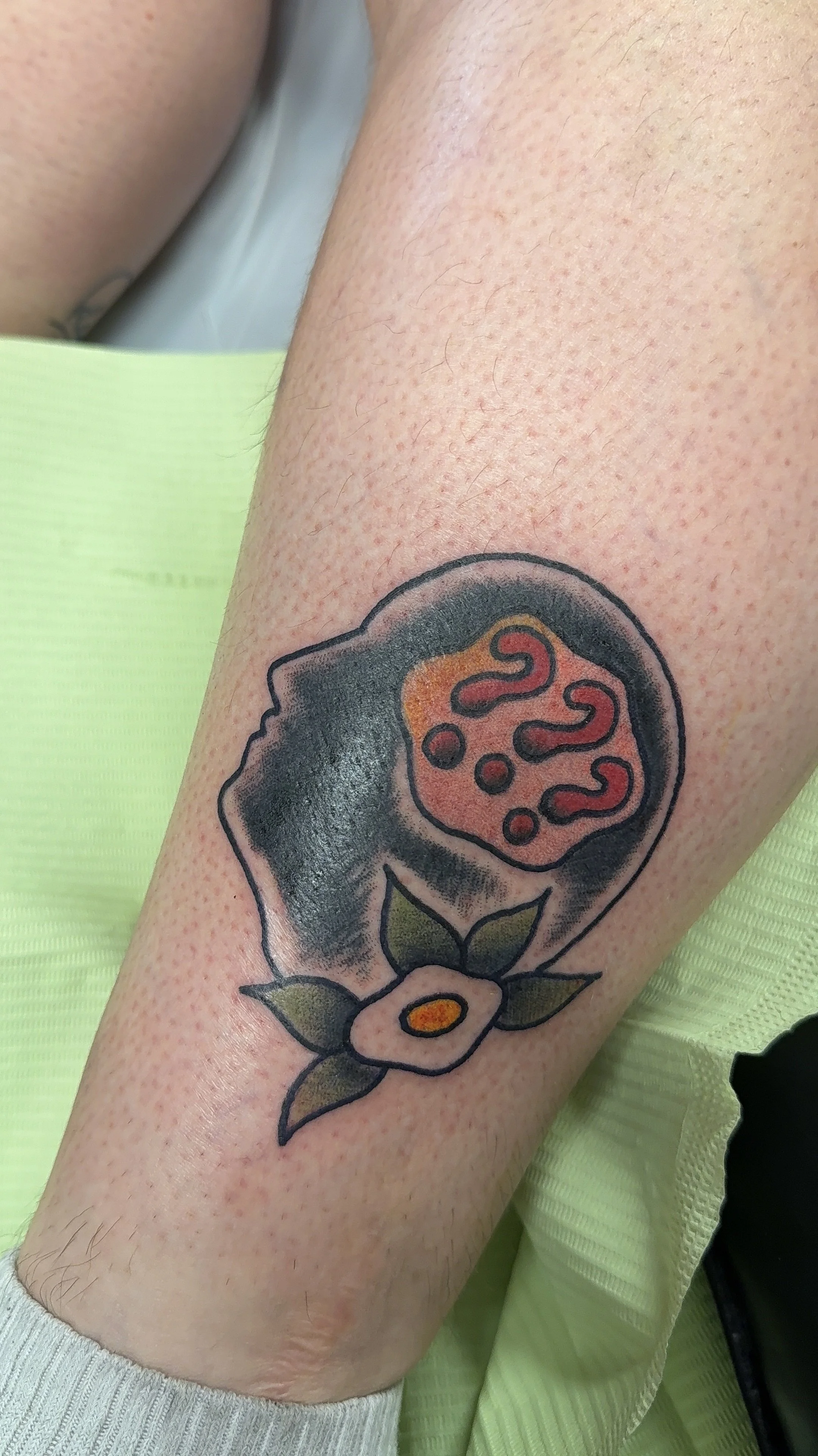 Tattoo of a flower with a cartoonish face, featuring large eyes and a tear, with green leaves and a spiral at the stem's base, and a spiked black and gray shape in the top left corner.