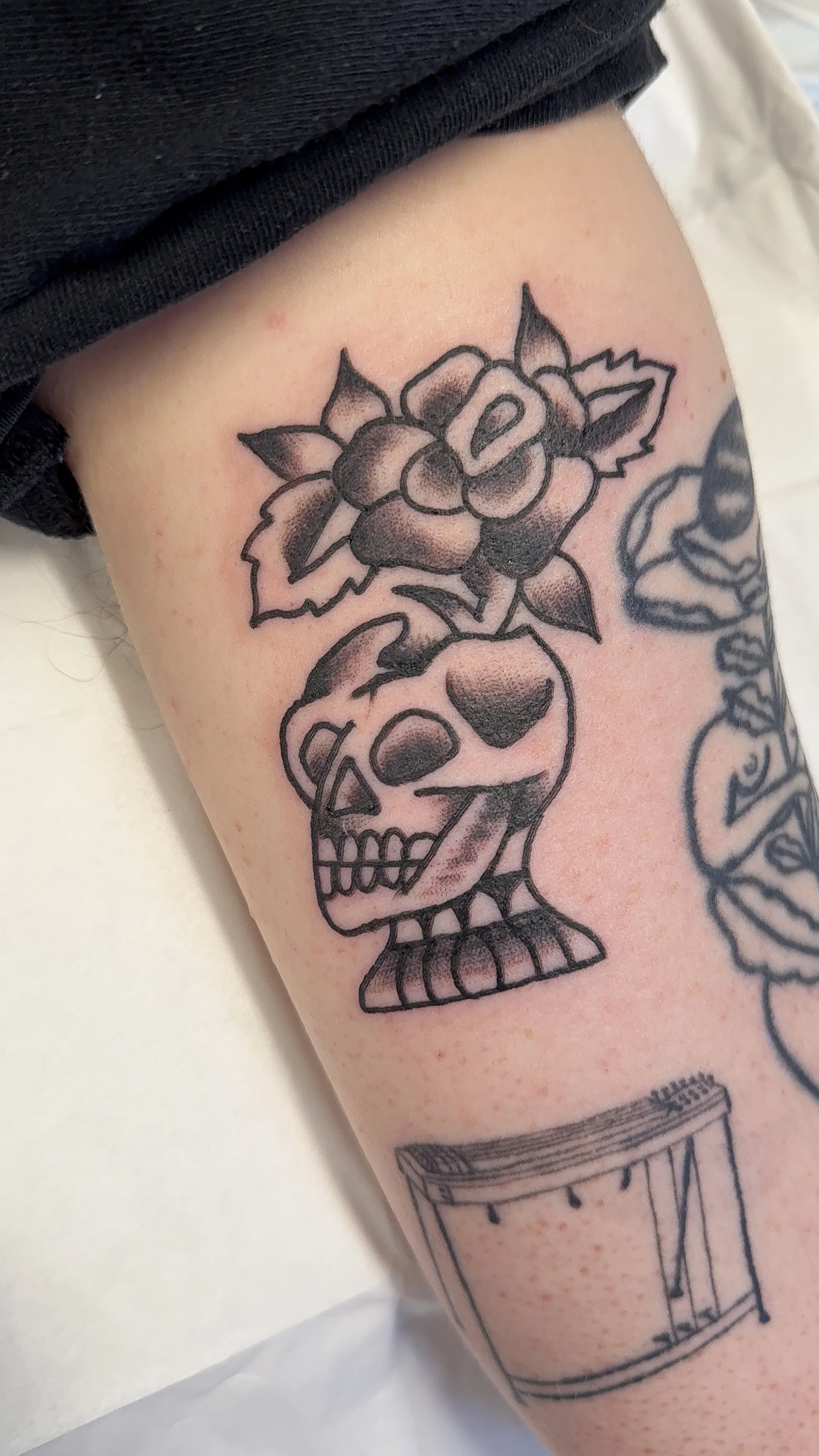 Black and white tattoo of a vase with flowers and hearts on an arm.