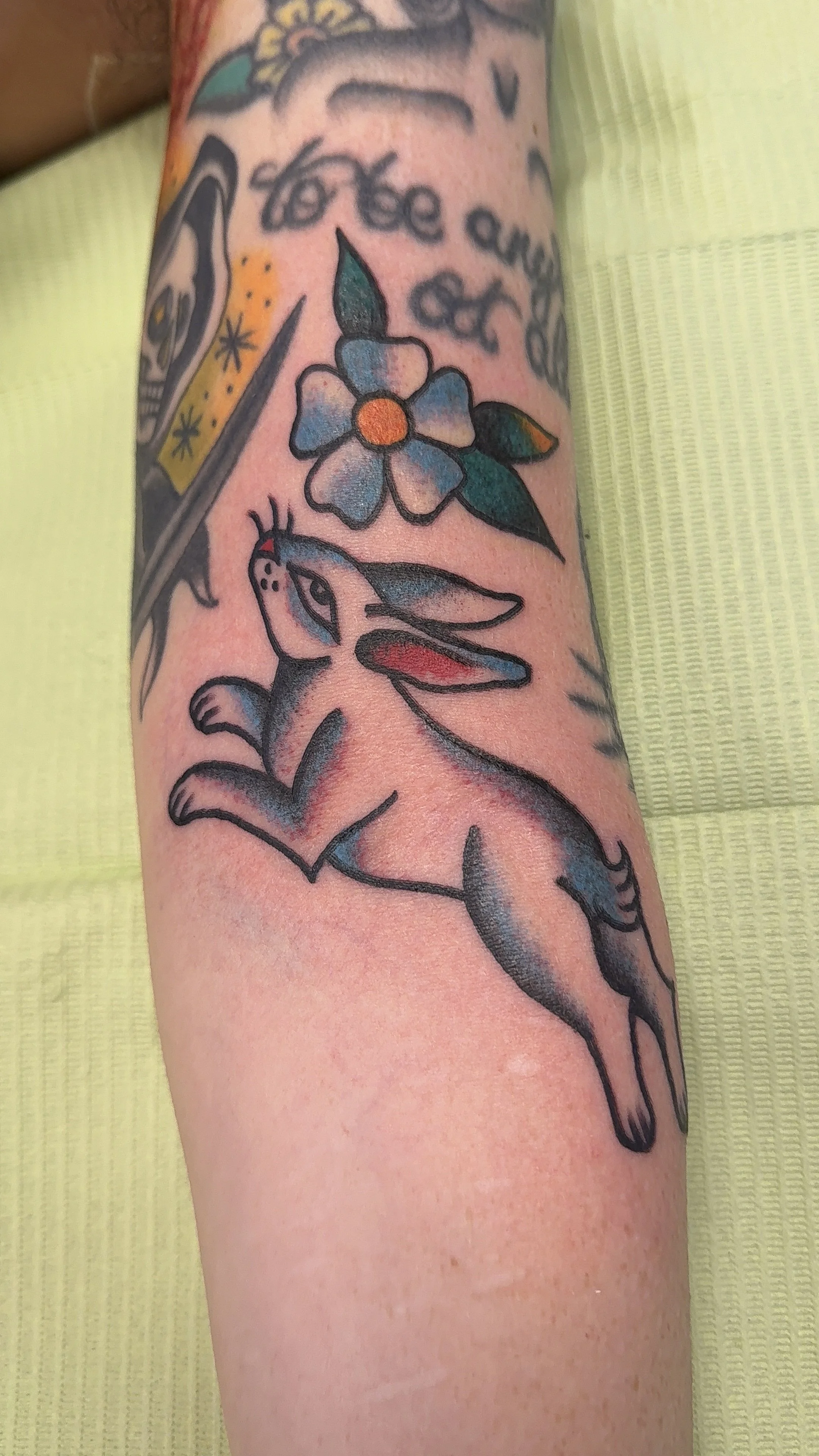 American Traditional  color running rabbit jumping bunny tattoo pinwheel flower tattoo